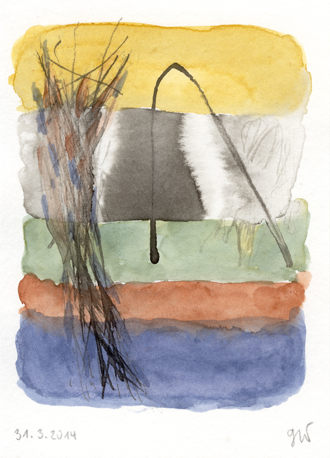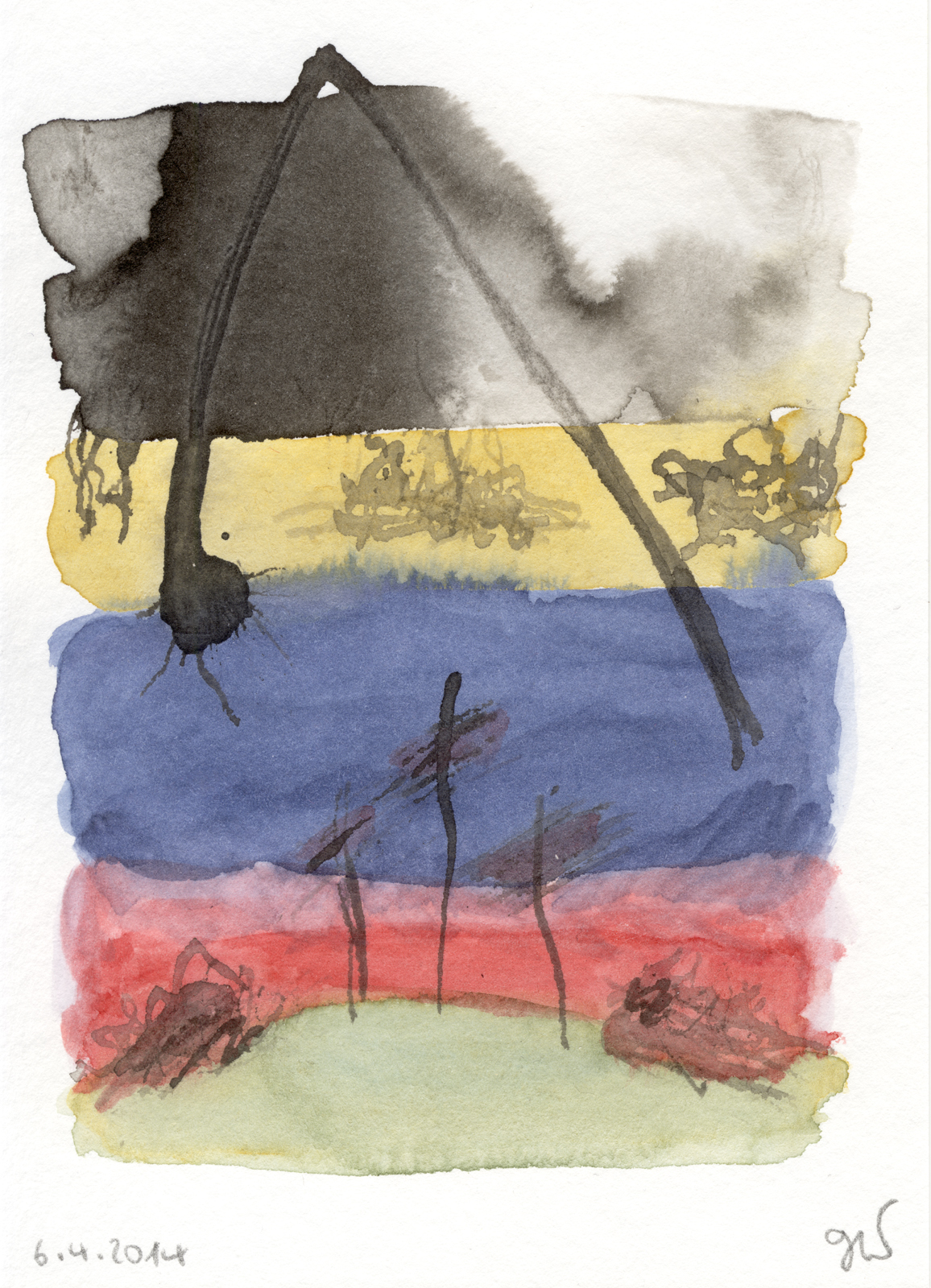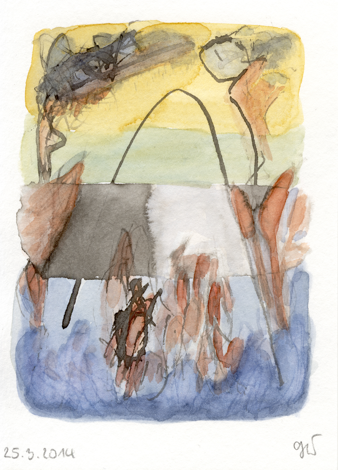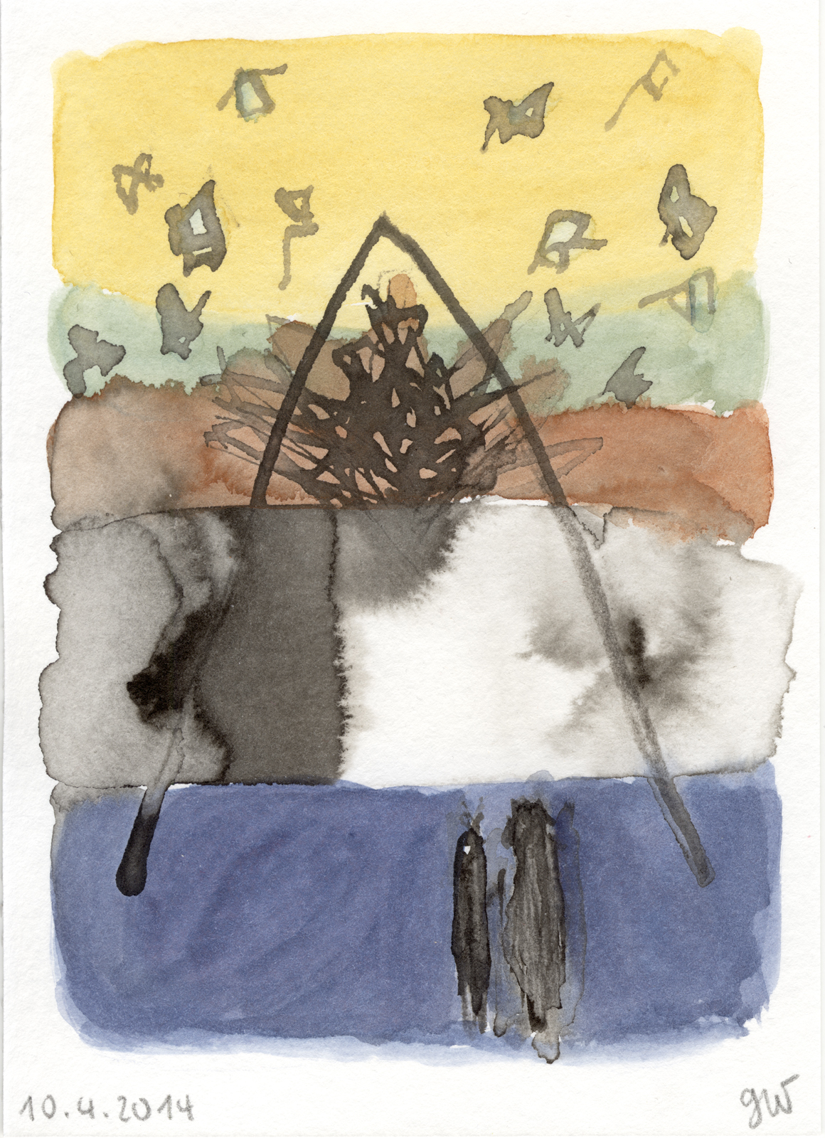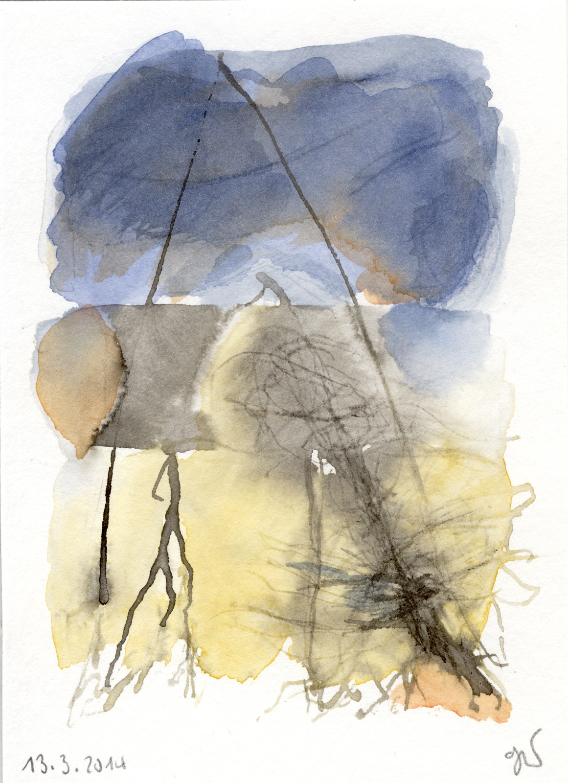 Im März/April 2014 nahm ich am Sozialkunstprojekt „Meine 40 Tagebuchaufzeichnungen in der Passionszeit“ in der Johanneskirche der Christengemeinschaft München-West teil. Die Projektleitung hatte die Kunsttherapeutin Rita Eckart. An jedem Tag entstand zur Vorübung und Motivfindung zunächst eine schwarzweiß Zeichnung mit Tusche und Rohrfeder, bevor ich das eigentliche Bild in Rohrfeder und Aquarell ausführte. Bei diesen beiden Blättern blieb es dann auch — um eine möglichst hohe Konzentration auf den Entstehungsprozess zu erreichen, erlaubte ich mir nicht, mehrere Versuche pro Tag zu machen.
