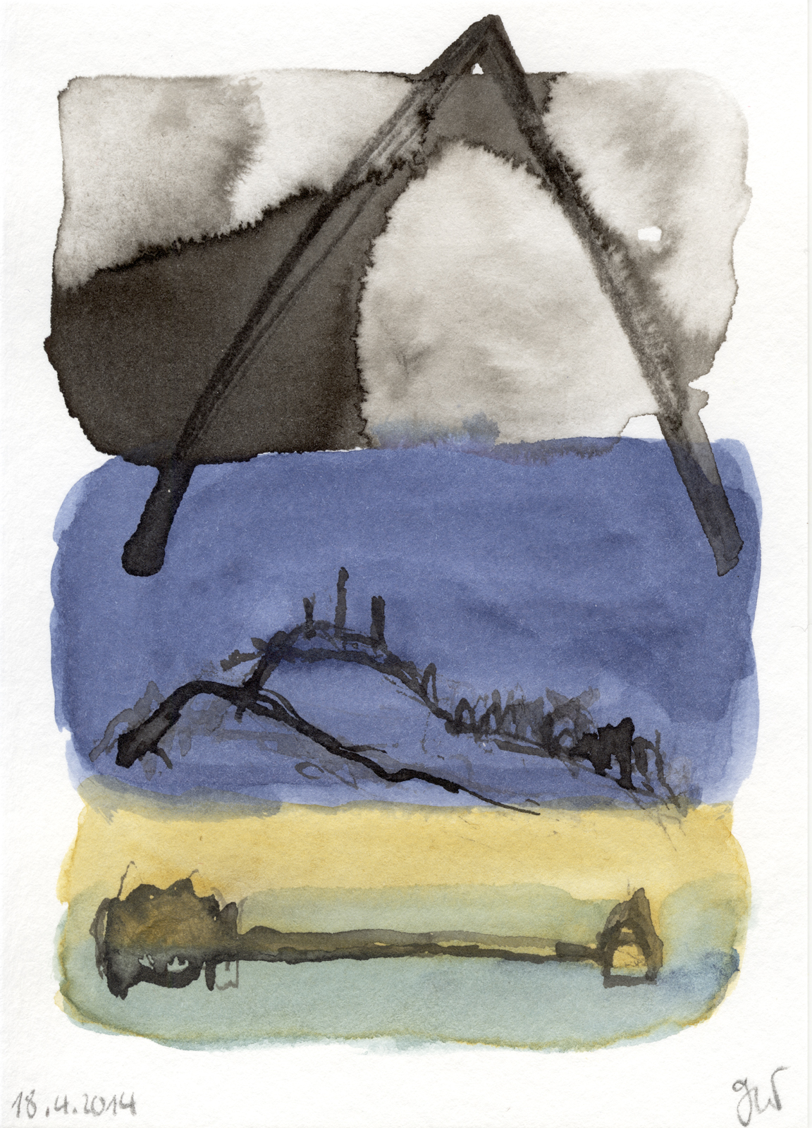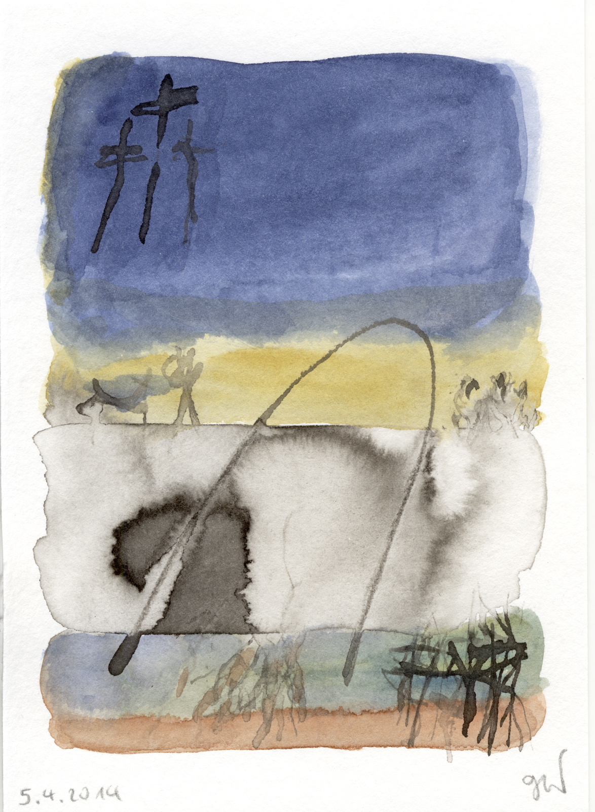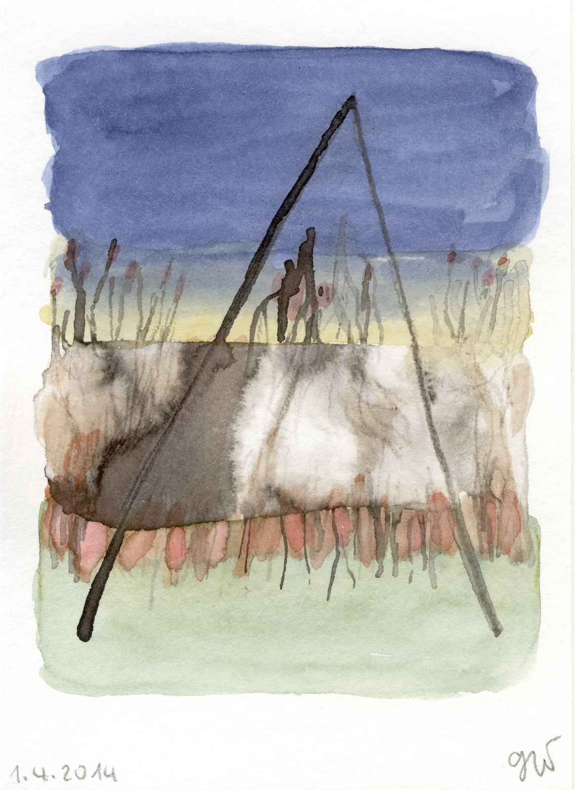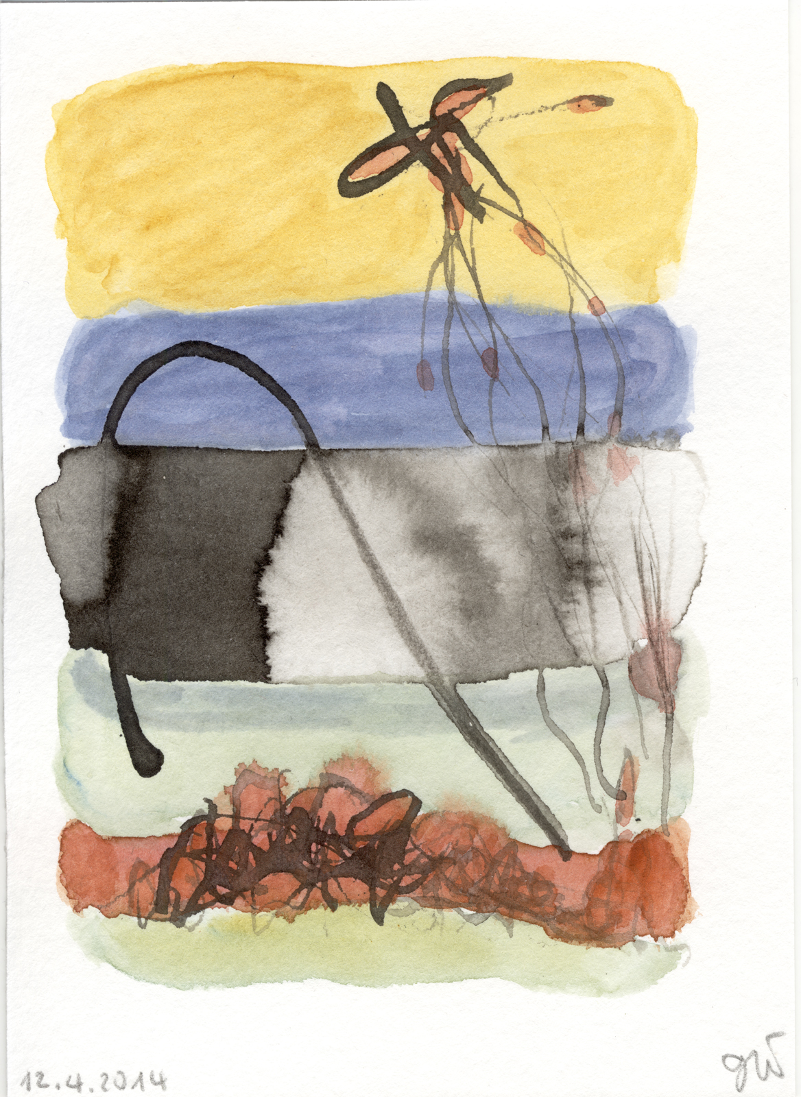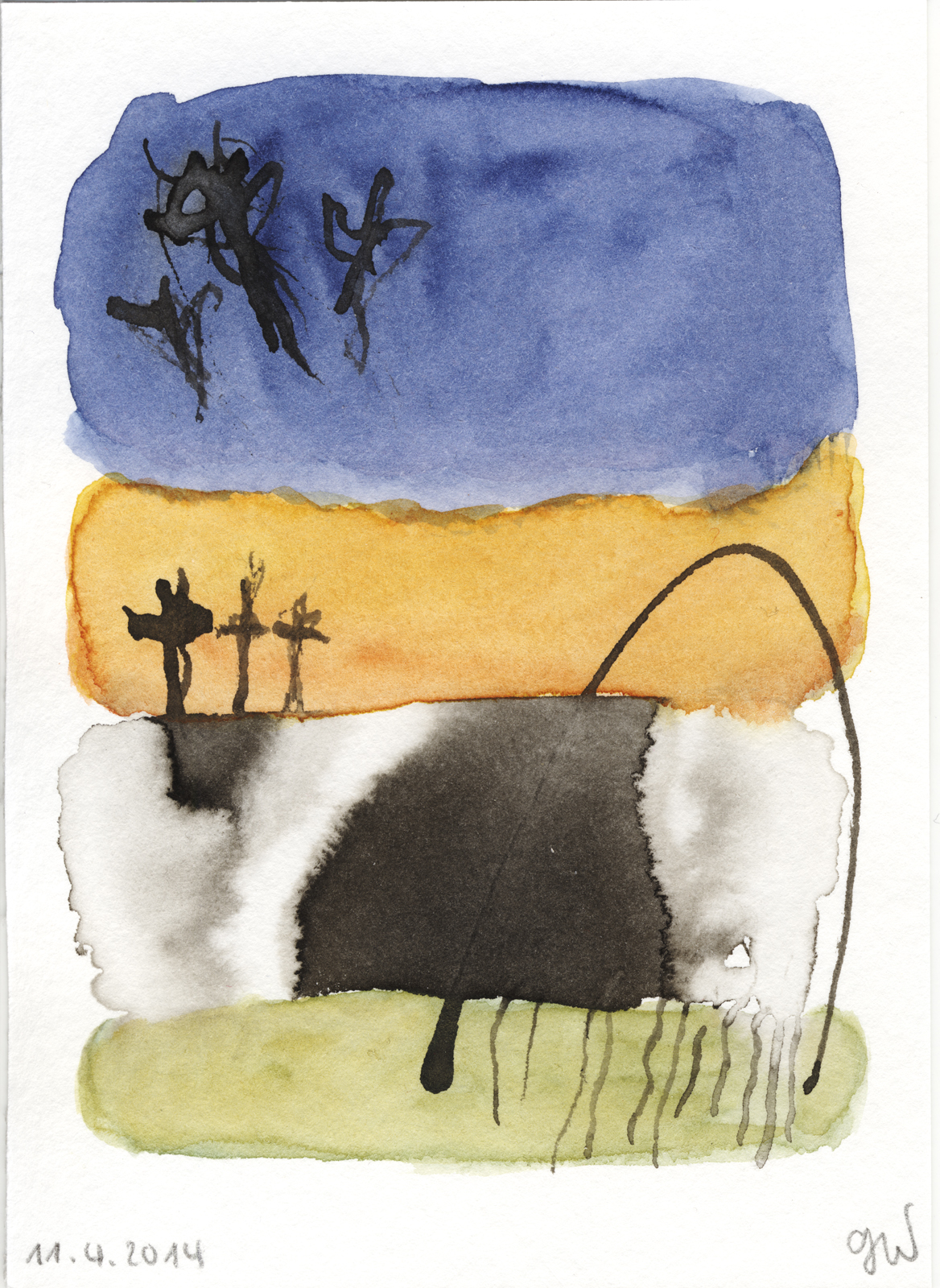 Im März/April 2014 nahm ich am Sozialkunstprojekt „Meine 40 Tagebuchaufzeichnungen in der Passionszeit“ in der Johanneskirche der Christengemeinschaft München-West teil. Die Projektleitung hatte die Kunsttherapeutin Rita Eckart. An jedem Tag entstand zur Vorübung und Motivfindung zunächst eine schwarzweiß Zeichnung mit Tusche und Rohrfeder, bevor ich das eigentliche Bild in Rohrfeder und Aquarell ausführte. Bei diesen beiden Blättern blieb es dann auch — um eine möglichst hohe Konzentration auf den Entstehungsprozess zu erreichen, erlaubte ich mir nicht, mehrere Versuche pro Tag zu machen.