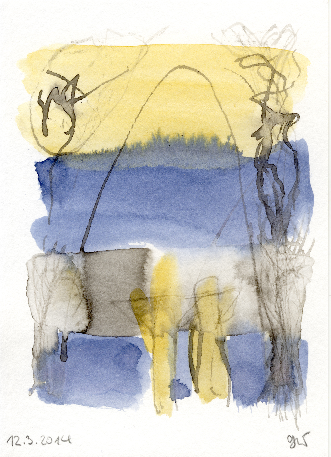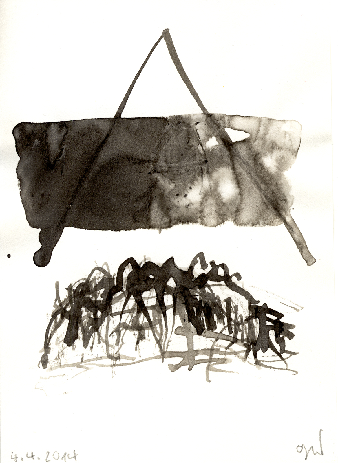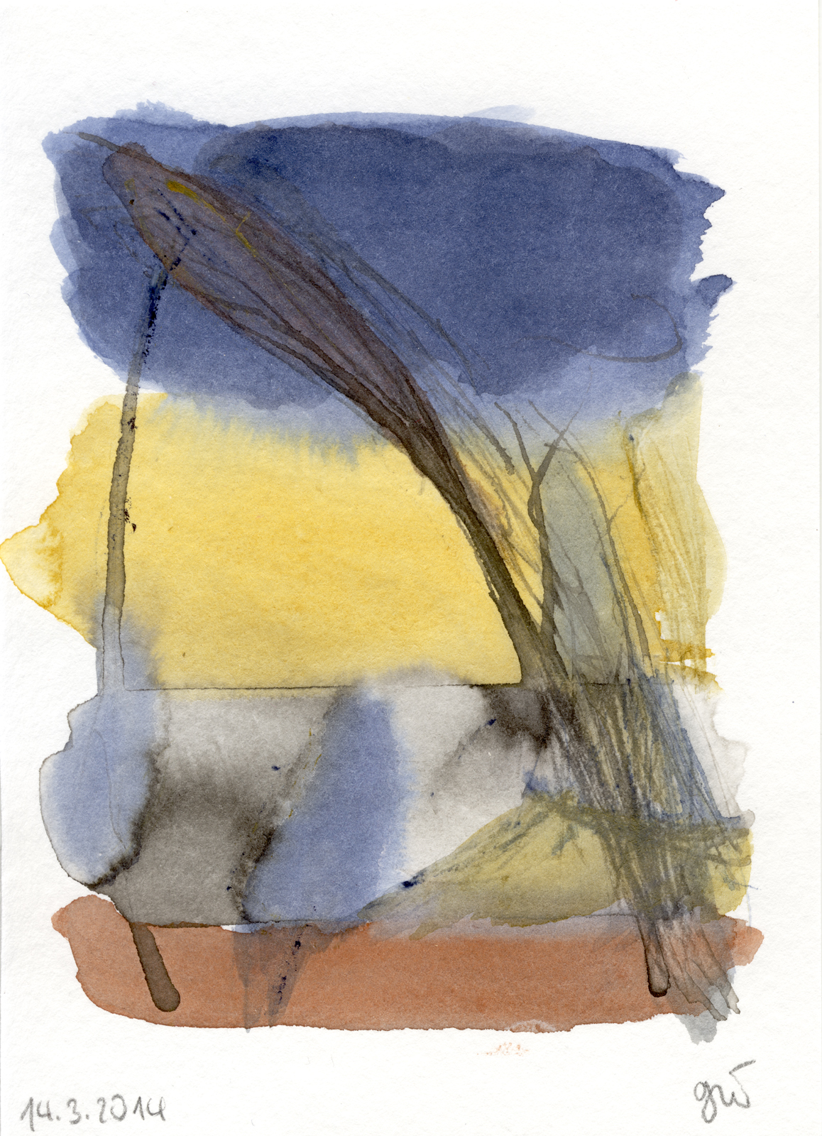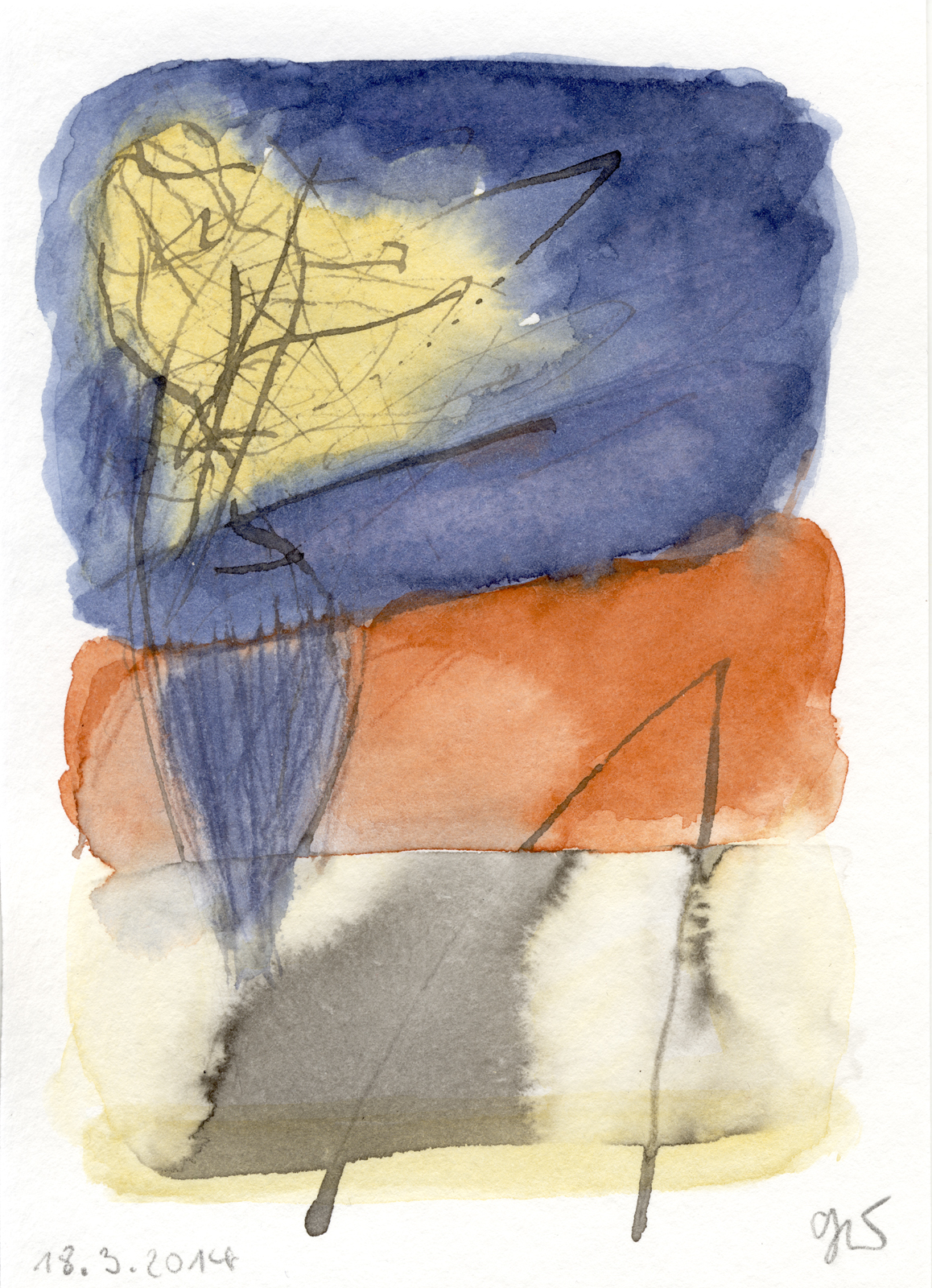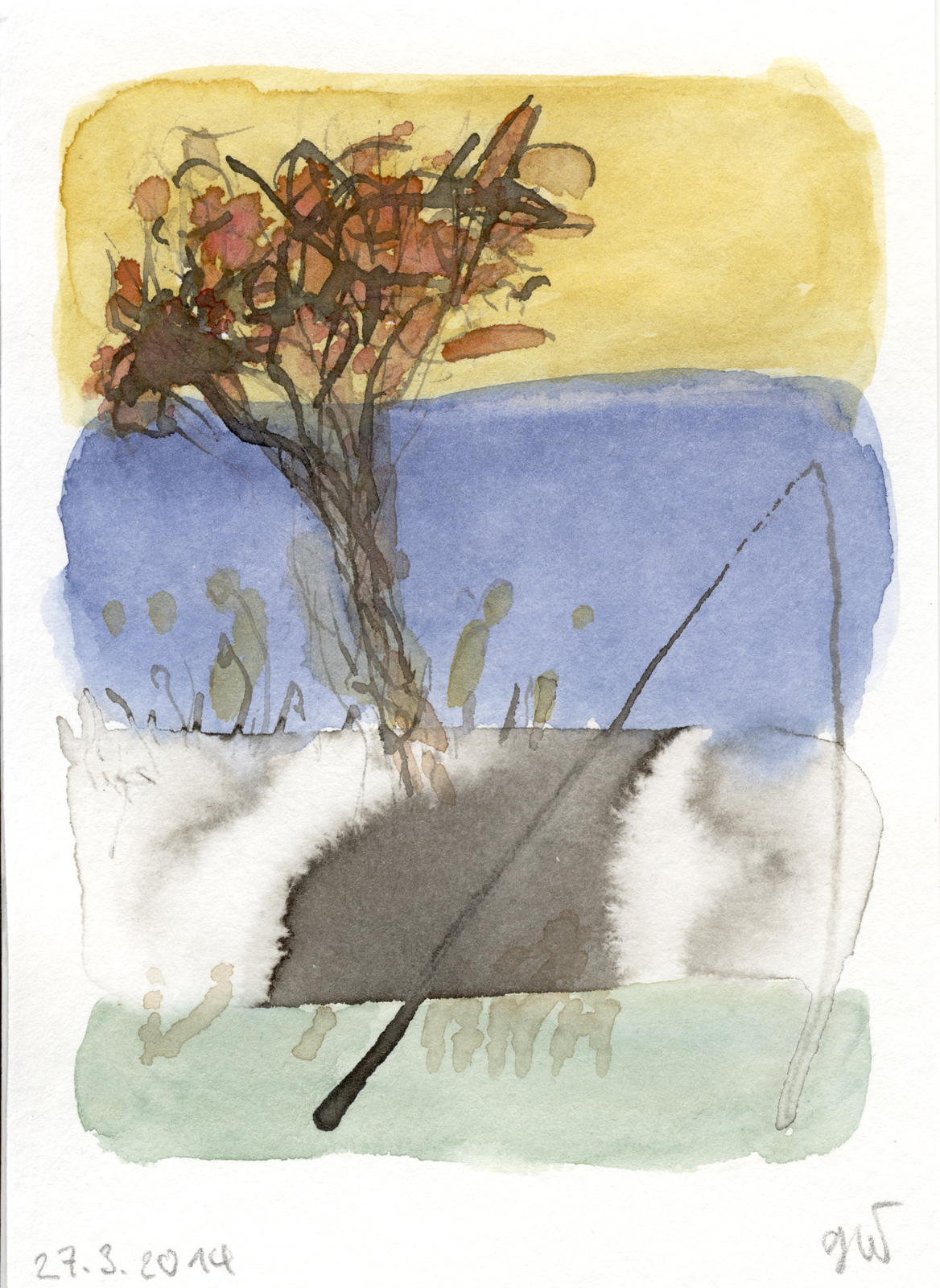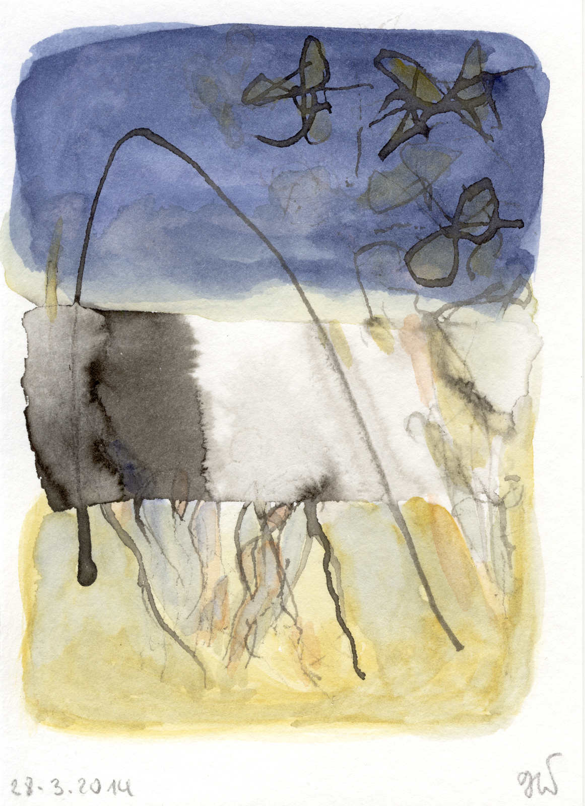 Im März/April 2014 nahm ich am Sozialkunstprojekt „Meine 40 Tagebuchaufzeichnungen in der Passionszeit“ in der Johanneskirche der Christengemeinschaft München-West teil. Die Projektleitung hatte die Kunsttherapeutin Rita Eckart. An jedem Tag entstand zur Vorübung und Motivfindung zunächst eine schwarzweiß Zeichnung mit Tusche und Rohrfeder, bevor ich das eigentliche Bild in Rohrfeder und Aquarell ausführte. Bei diesen beiden Blättern blieb es dann auch — um eine möglichst hohe Konzentration auf den Entstehungsprozess zu erreichen, erlaubte ich mir nicht, mehrere Versuche pro Tag zu machen.