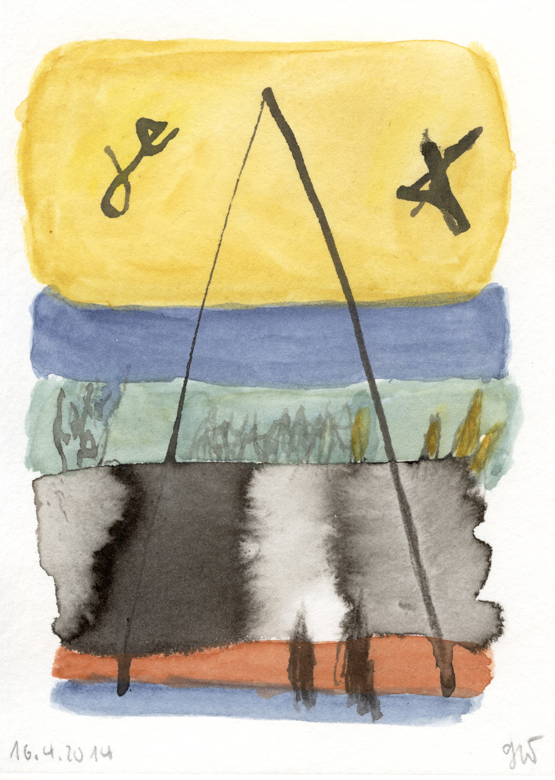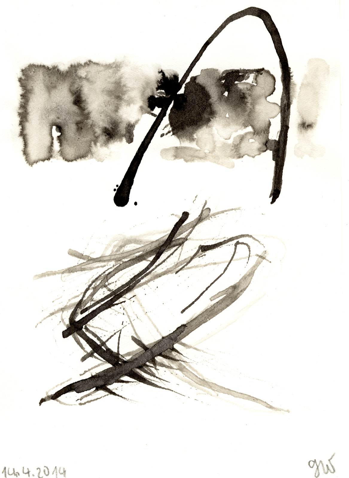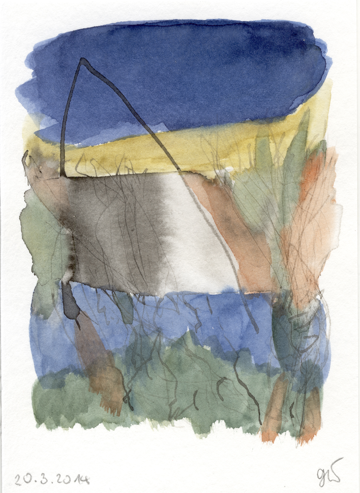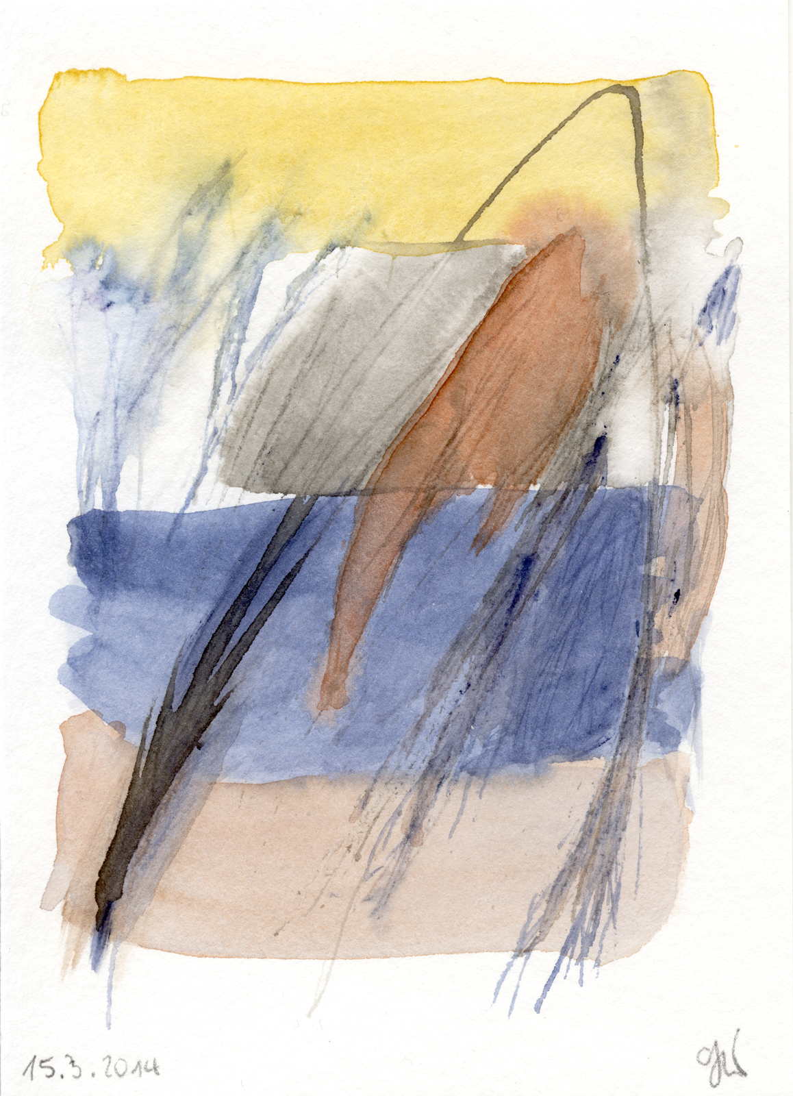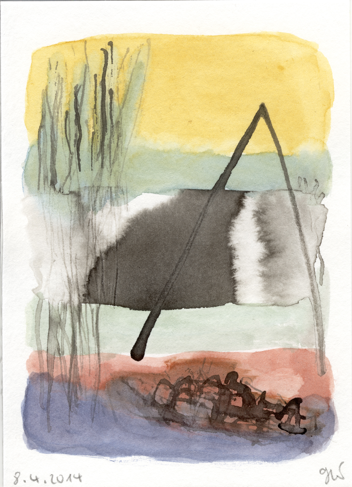 Im März/April 2014 nahm ich am Sozialkunstprojekt „Meine 40 Tagebuchaufzeichnungen in der Passionszeit“ in der Johanneskirche der Christengemeinschaft München-West teil. Die Projektleitung hatte die Kunsttherapeutin Rita Eckart. An jedem Tag entstand zur Vorübung und Motivfindung zunächst eine schwarzweiß Zeichnung mit Tusche und Rohrfeder, bevor ich das eigentliche Bild in Rohrfeder und Aquarell ausführte. Bei diesen beiden Blättern blieb es dann auch — um eine möglichst hohe Konzentration auf den Entstehungsprozess zu erreichen, erlaubte ich mir nicht, mehrere Versuche pro Tag zu machen.