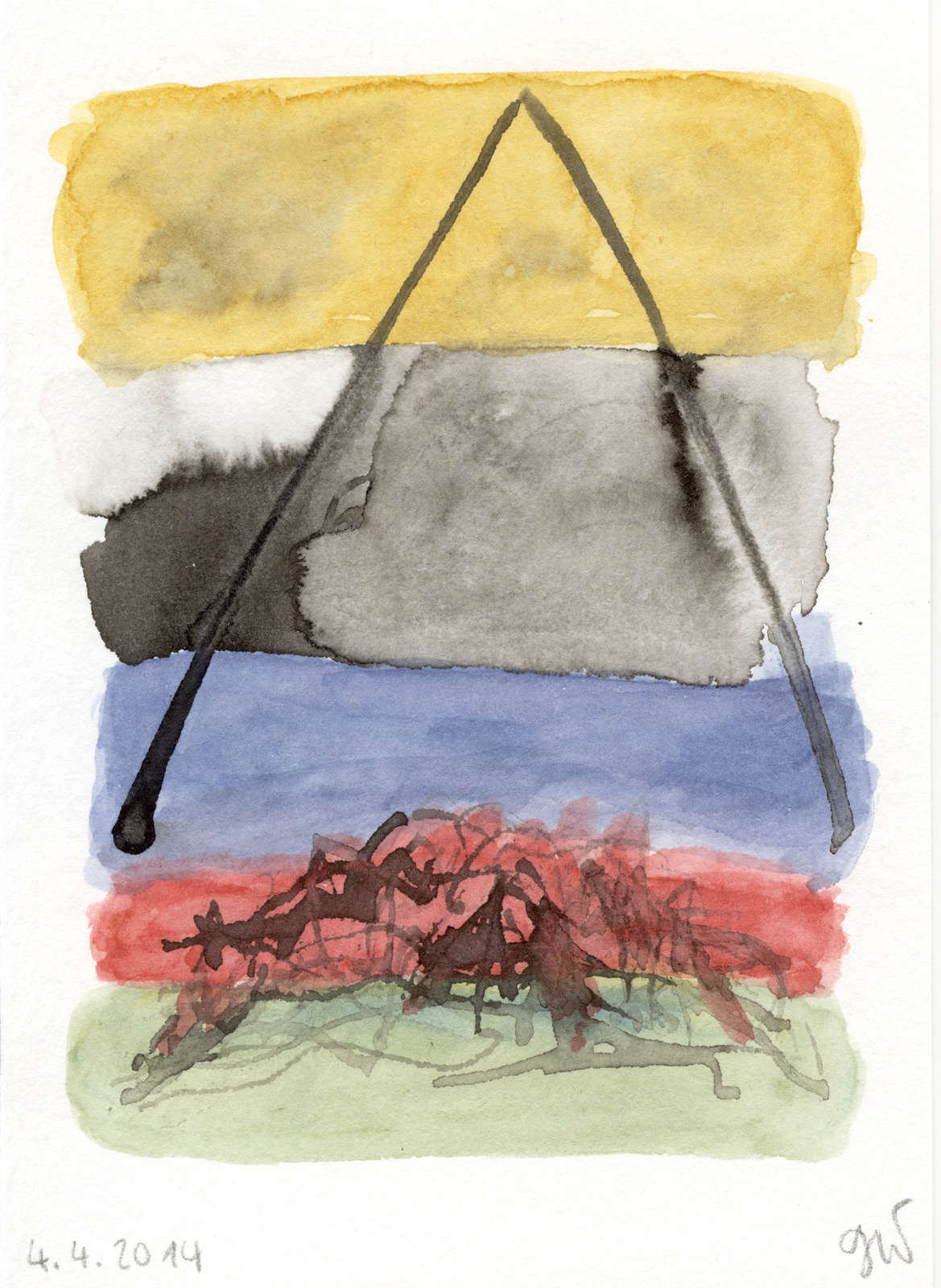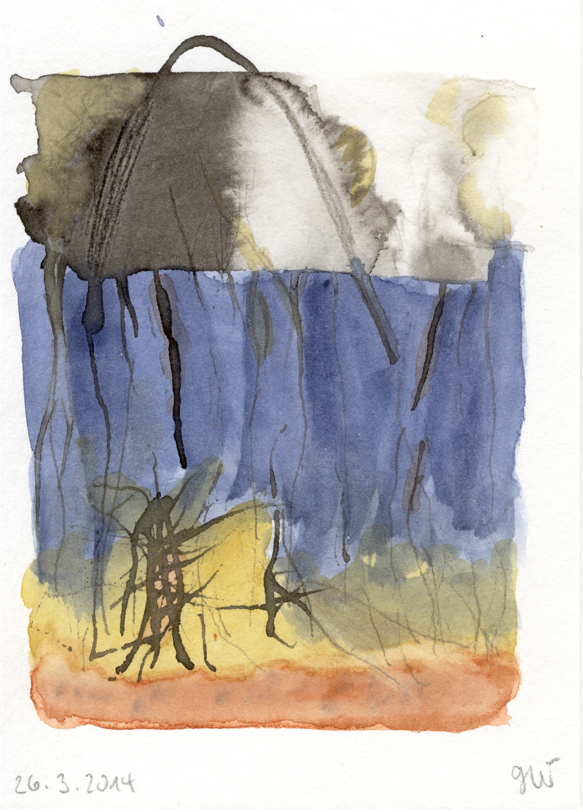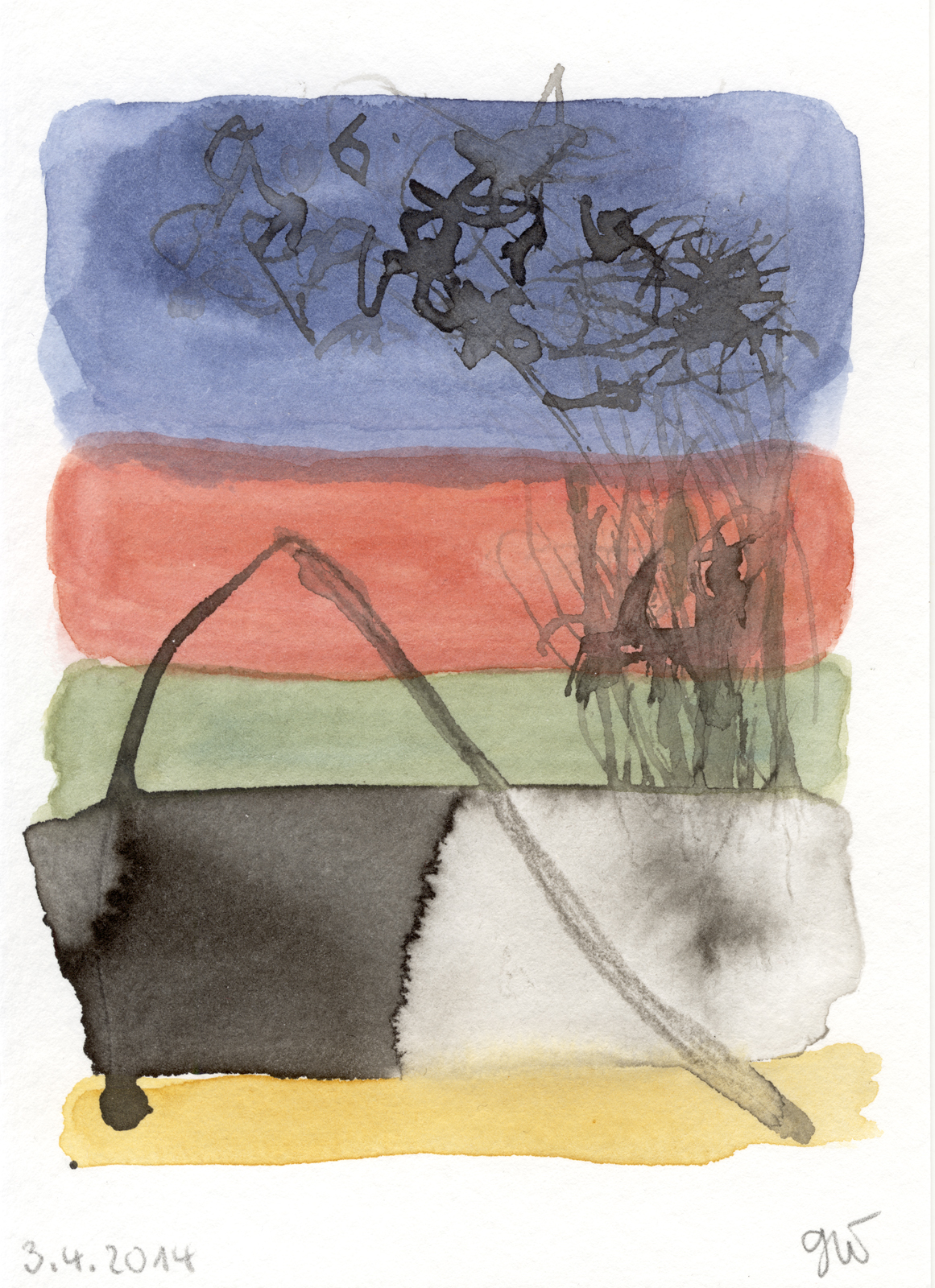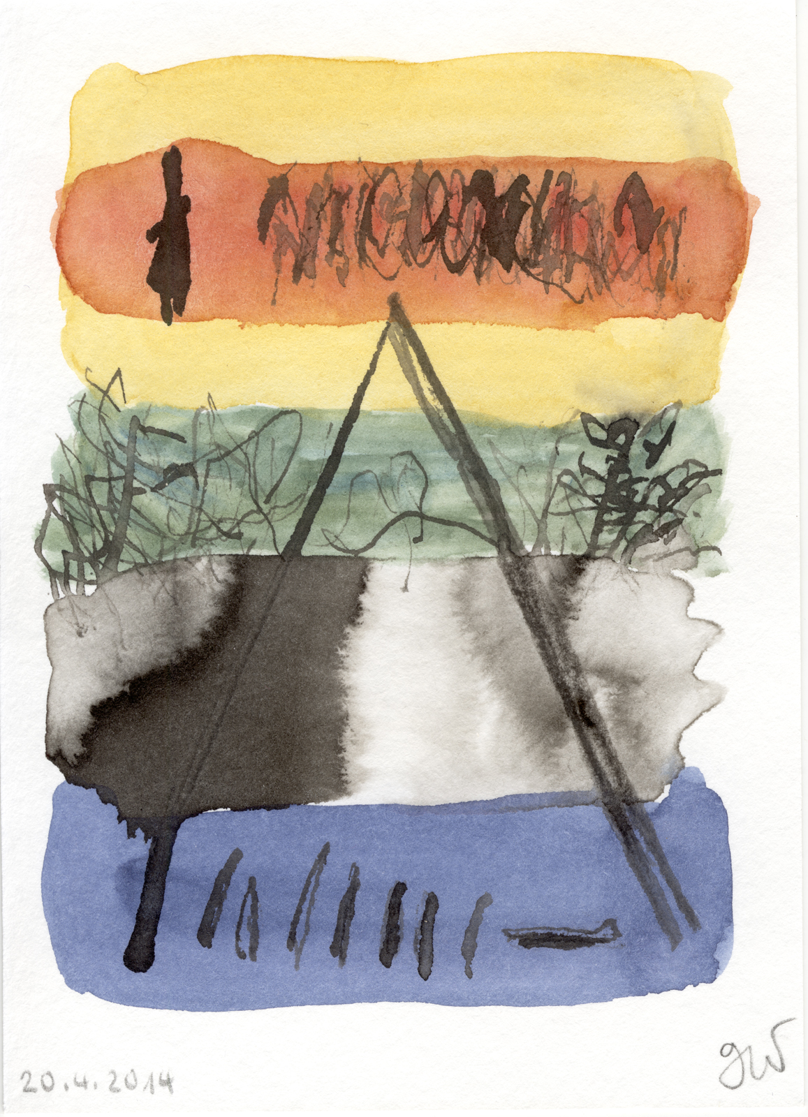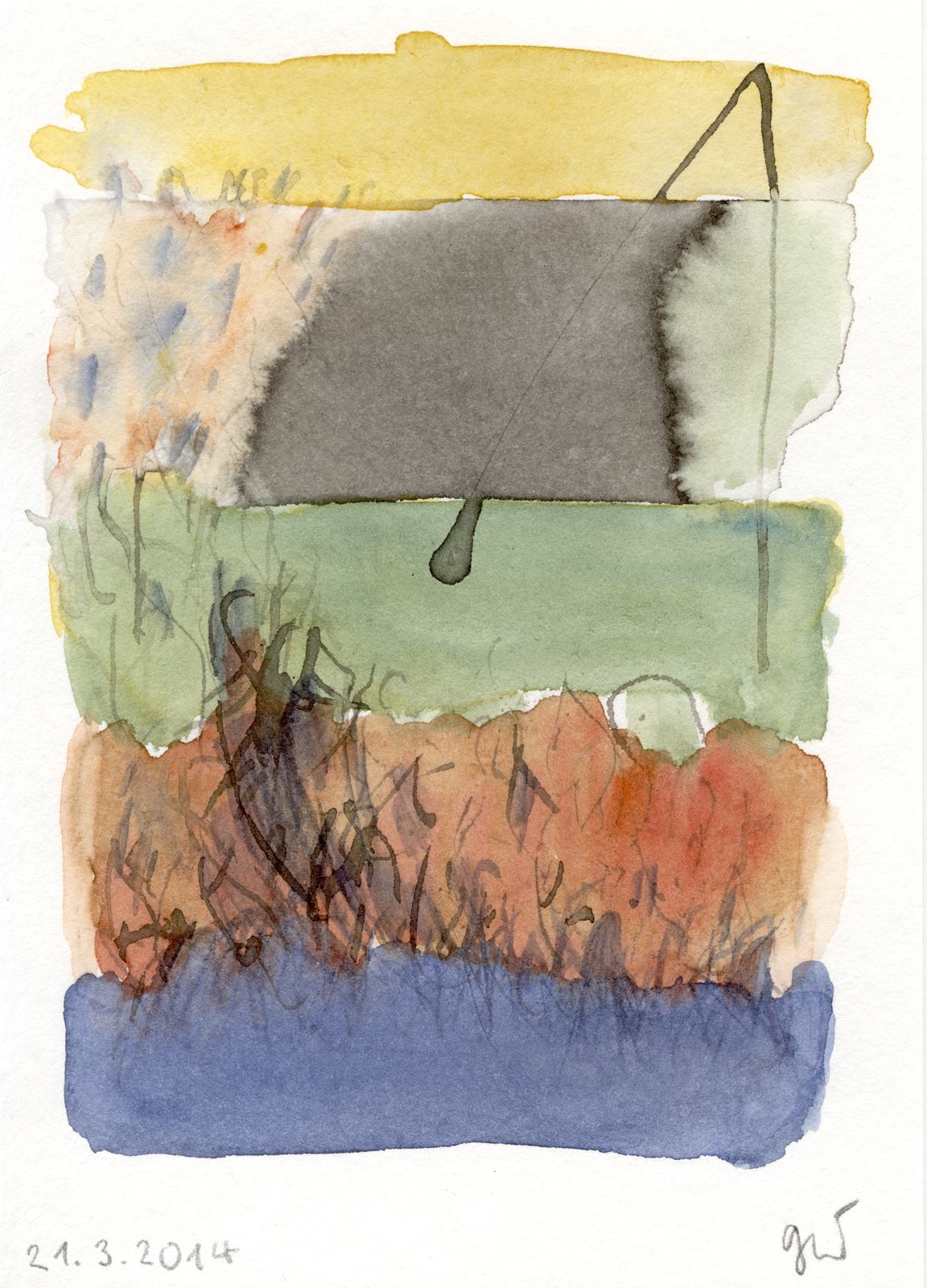 Im März/April 2014 nahm ich am Sozialkunstprojekt „Meine 40 Tagebuchaufzeichnungen in der Passionszeit“ in der Johanneskirche der Christengemeinschaft München-West teil. Die Projektleitung hatte die Kunsttherapeutin Rita Eckart. An jedem Tag entstand zur Vorübung und Motivfindung zunächst eine schwarzweiß Zeichnung mit Tusche und Rohrfeder, bevor ich das eigentliche Bild in Rohrfeder und Aquarell ausführte. Bei diesen beiden Blättern blieb es dann auch — um eine möglichst hohe Konzentration auf den Entstehungsprozess zu erreichen, erlaubte ich mir nicht, mehrere Versuche pro Tag zu machen.