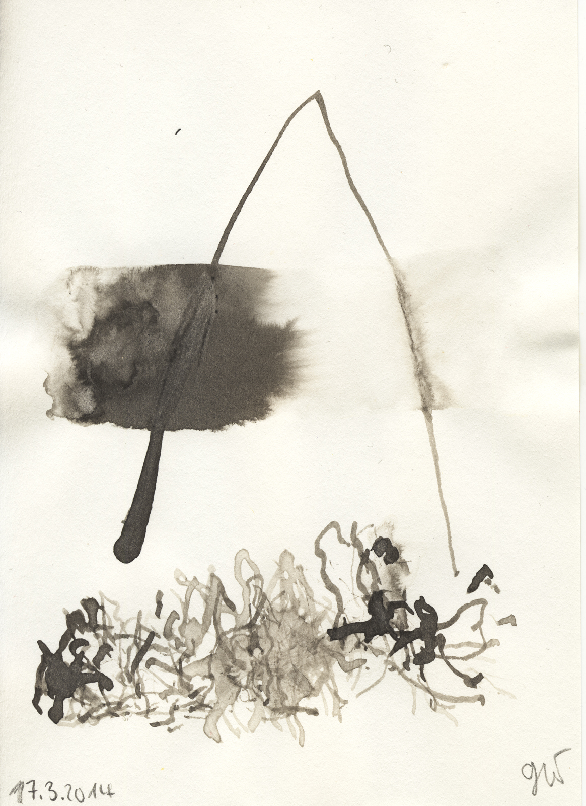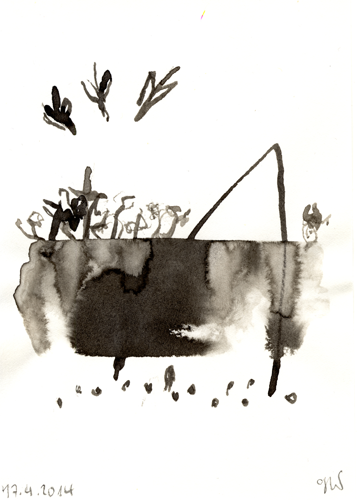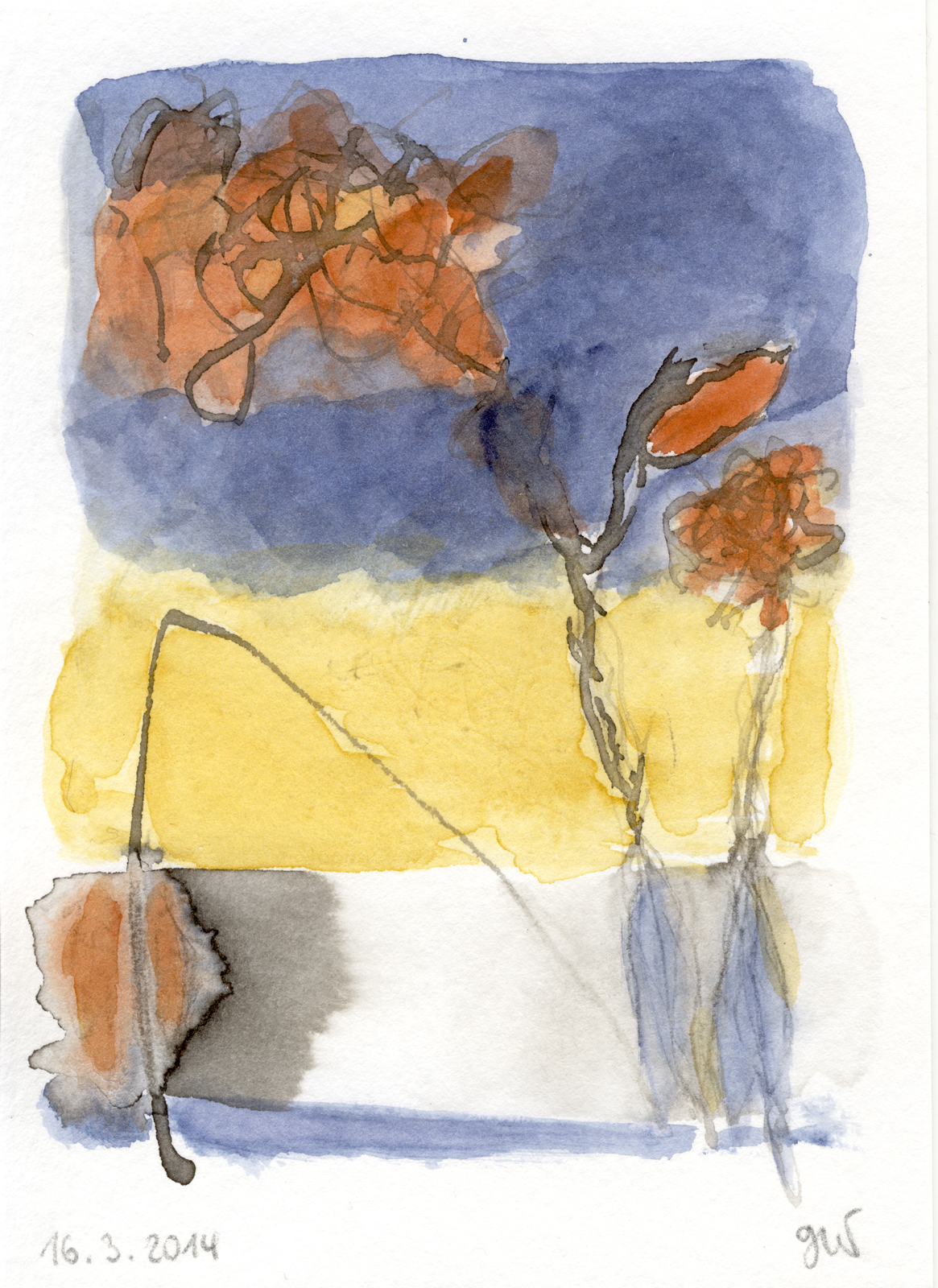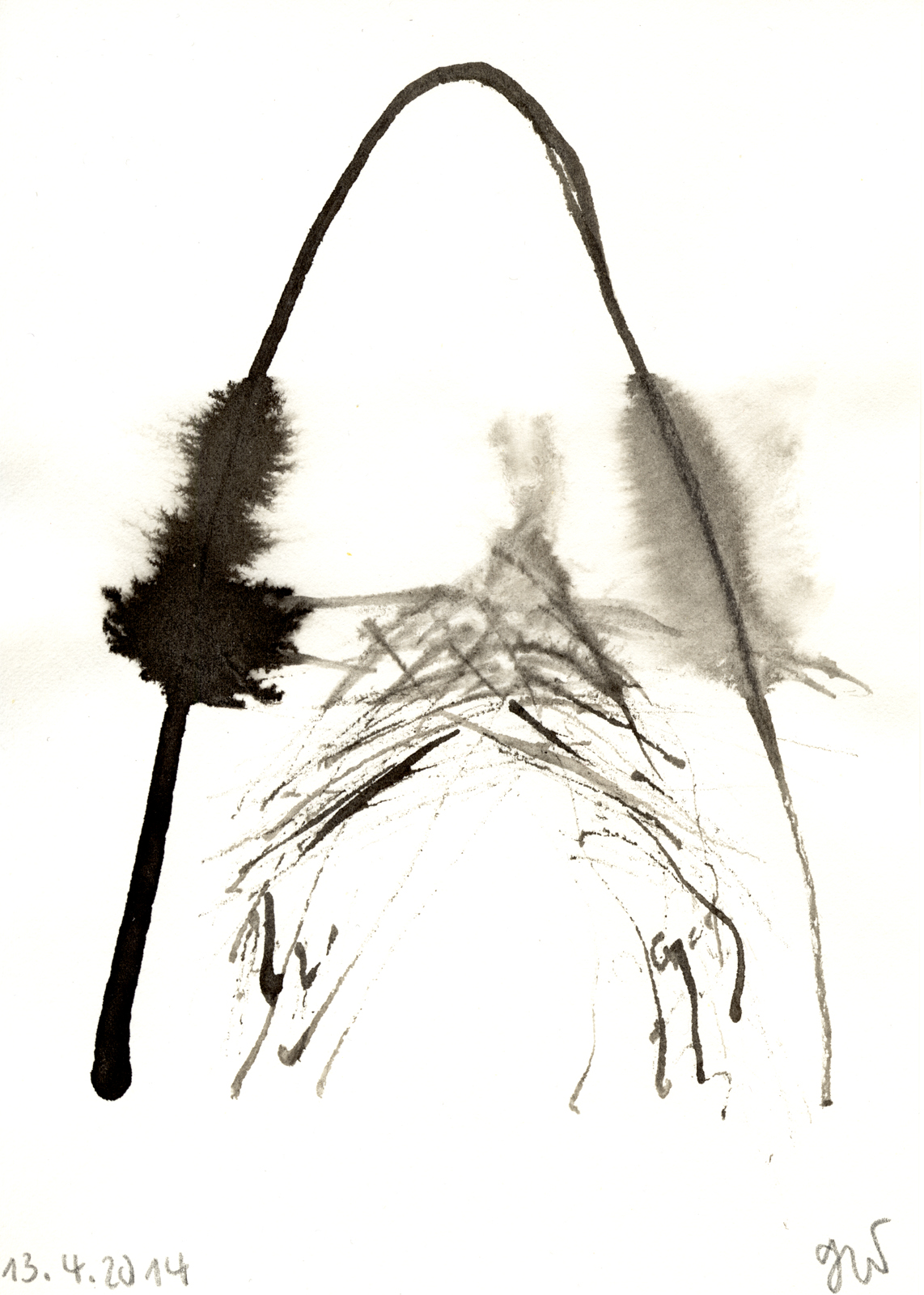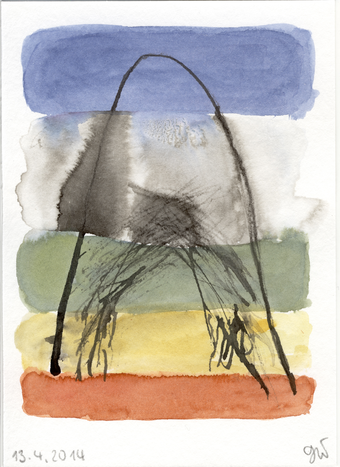 Im März/April 2014 nahm ich am Sozialkunstprojekt „Meine 40 Tagebuchaufzeichnungen in der Passionszeit“ in der Johanneskirche der Christengemeinschaft München-West teil. Die Projektleitung hatte die Kunsttherapeutin Rita Eckart. An jedem Tag entstand zur Vorübung und Motivfindung zunächst eine schwarzweiß Zeichnung mit Tusche und Rohrfeder, bevor ich das eigentliche Bild in Rohrfeder und Aquarell ausführte. Bei diesen beiden Blättern blieb es dann auch — um eine möglichst hohe Konzentration auf den Entstehungsprozess zu erreichen, erlaubte ich mir nicht, mehrere Versuche pro Tag zu machen.
