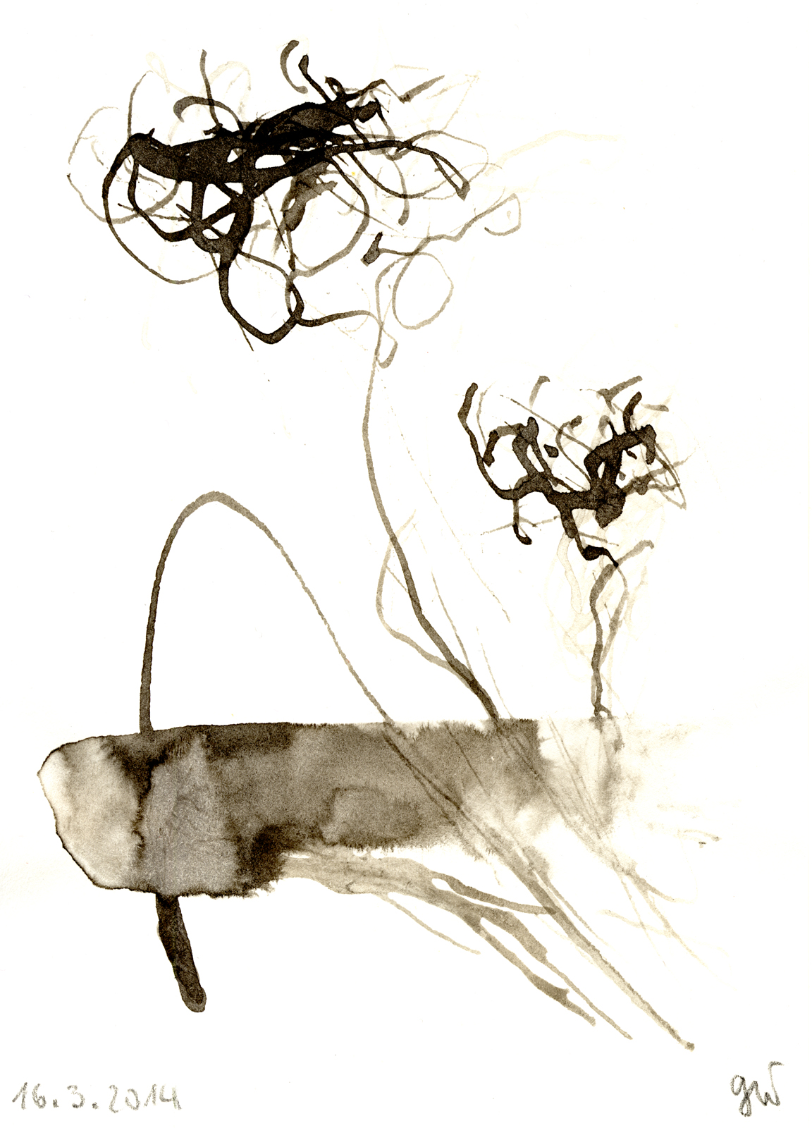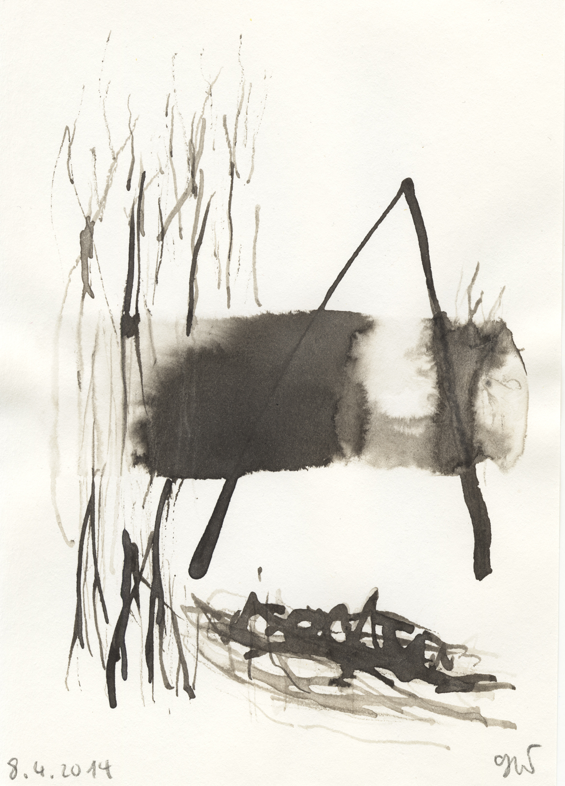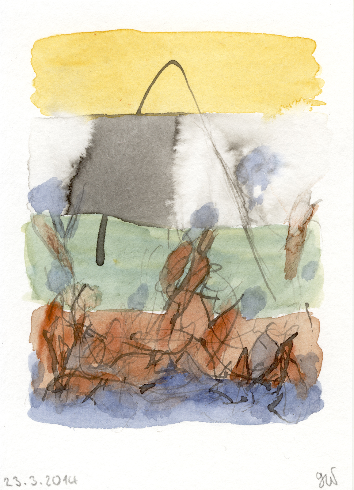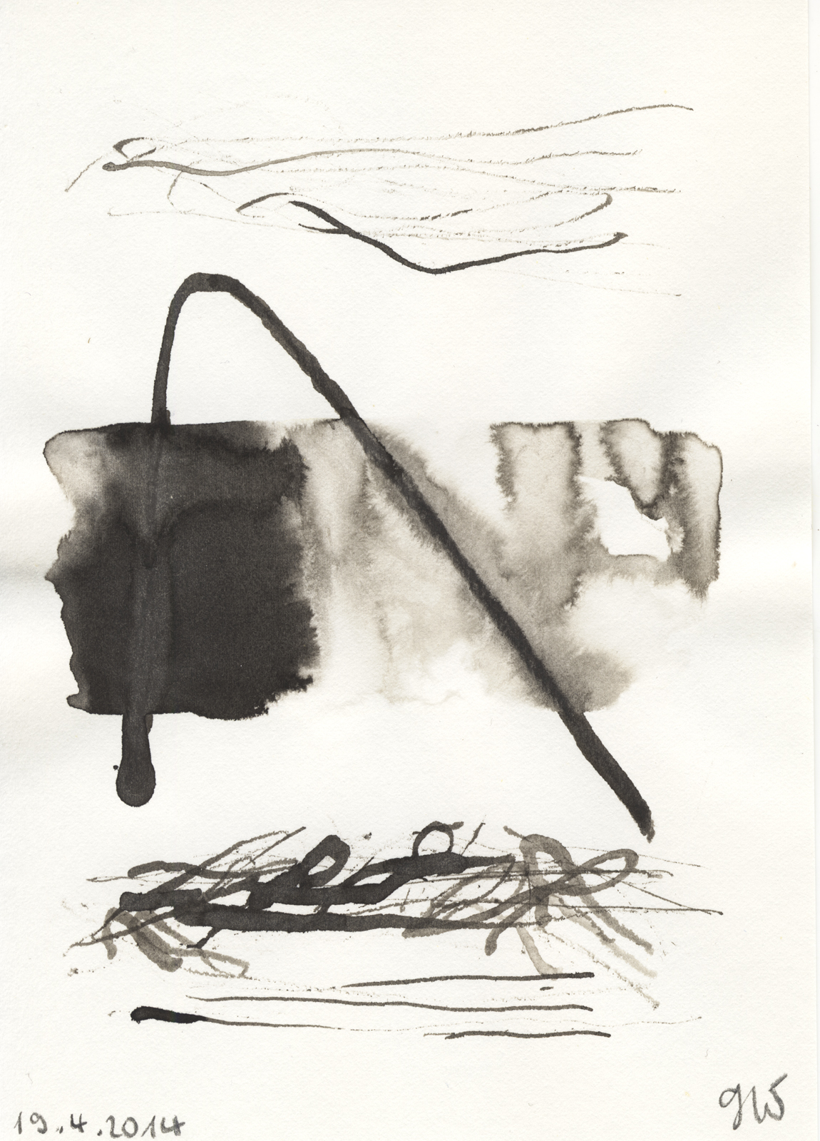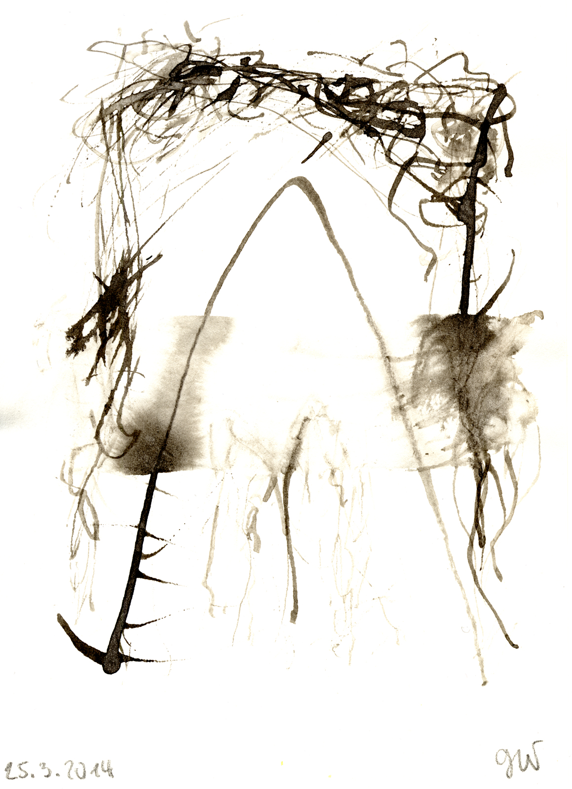 Im März/April 2014 nahm ich am Sozialkunstprojekt „Meine 40 Tagebuchaufzeichnungen in der Passionszeit“ in der Johanneskirche der Christengemeinschaft München-West teil. Die Projektleitung hatte die Kunsttherapeutin Rita Eckart. An jedem Tag entstand zur Vorübung und Motivfindung zunächst eine schwarzweiß Zeichnung mit Tusche und Rohrfeder, bevor ich das eigentliche Bild in Rohrfeder und Aquarell ausführte. Bei diesen beiden Blättern blieb es dann auch — um eine möglichst hohe Konzentration auf den Entstehungsprozess zu erreichen, erlaubte ich mir nicht, mehrere Versuche pro Tag zu machen.