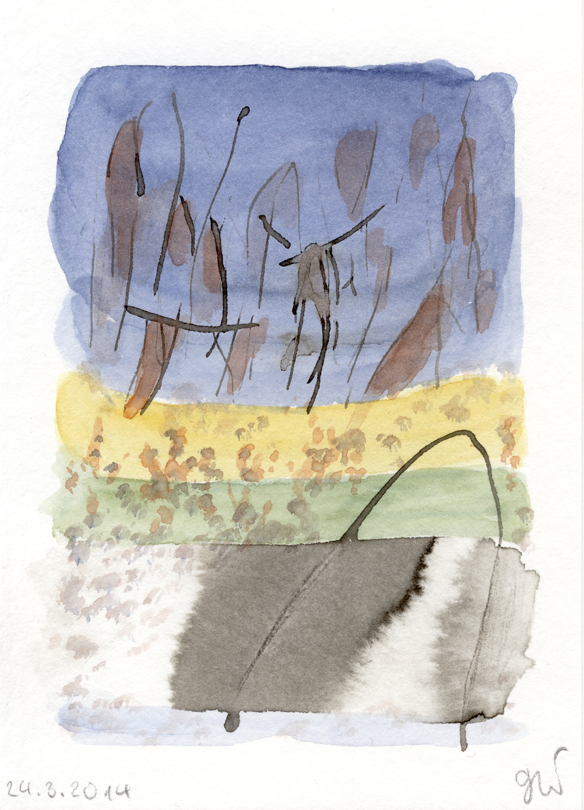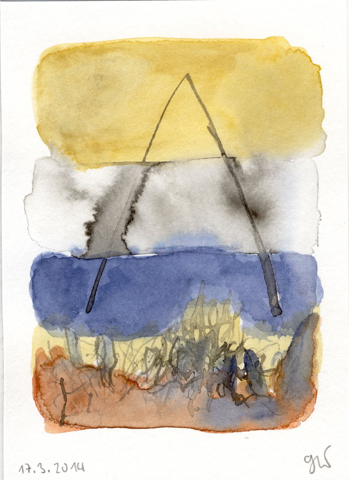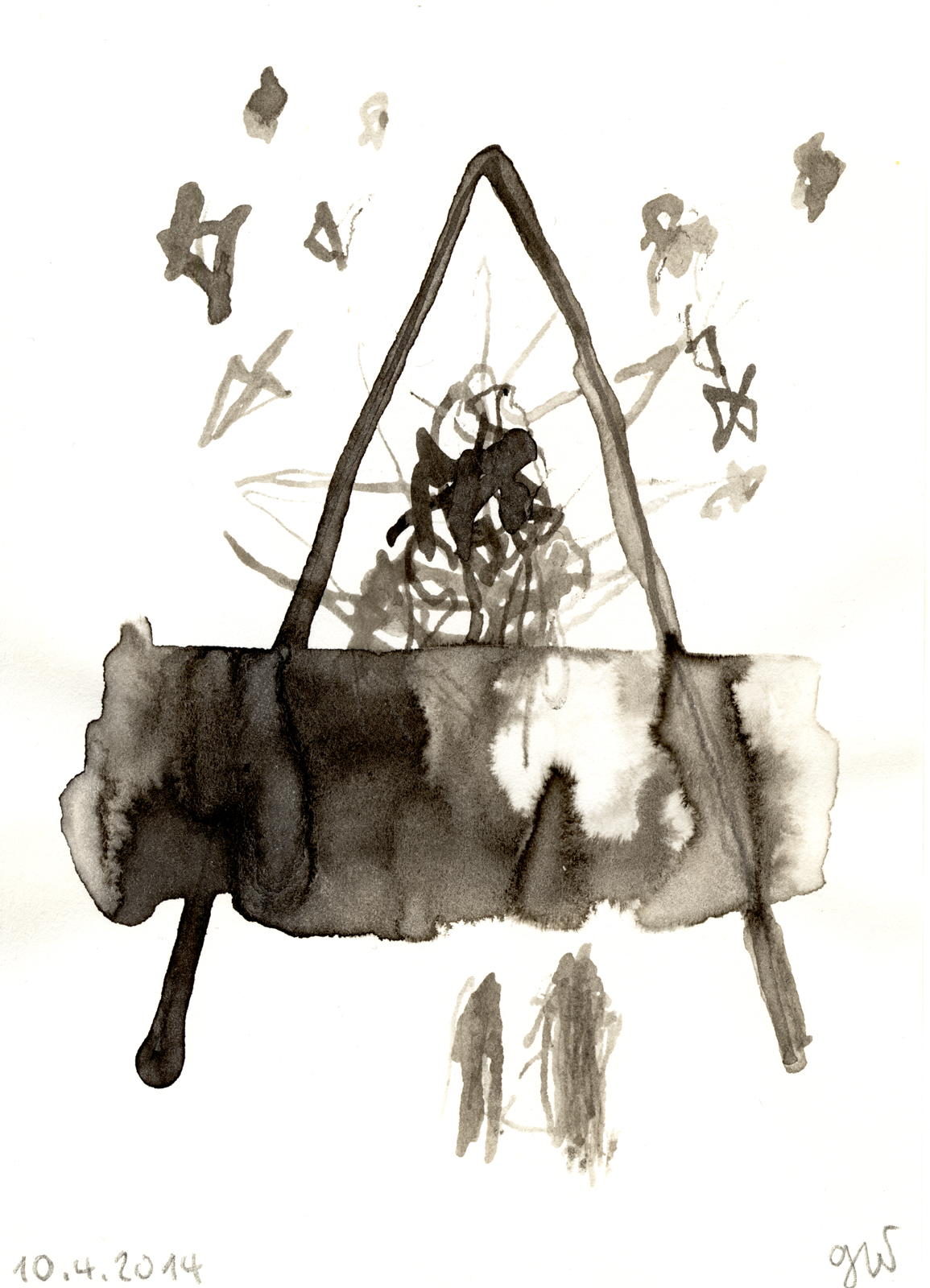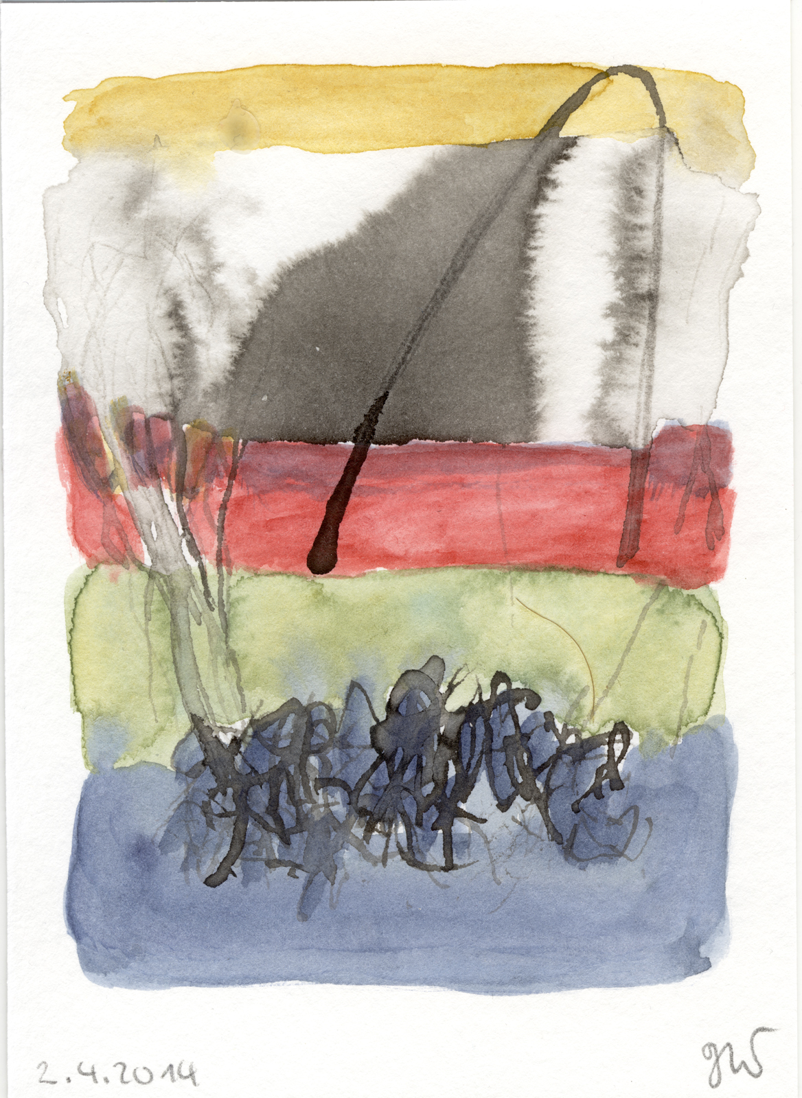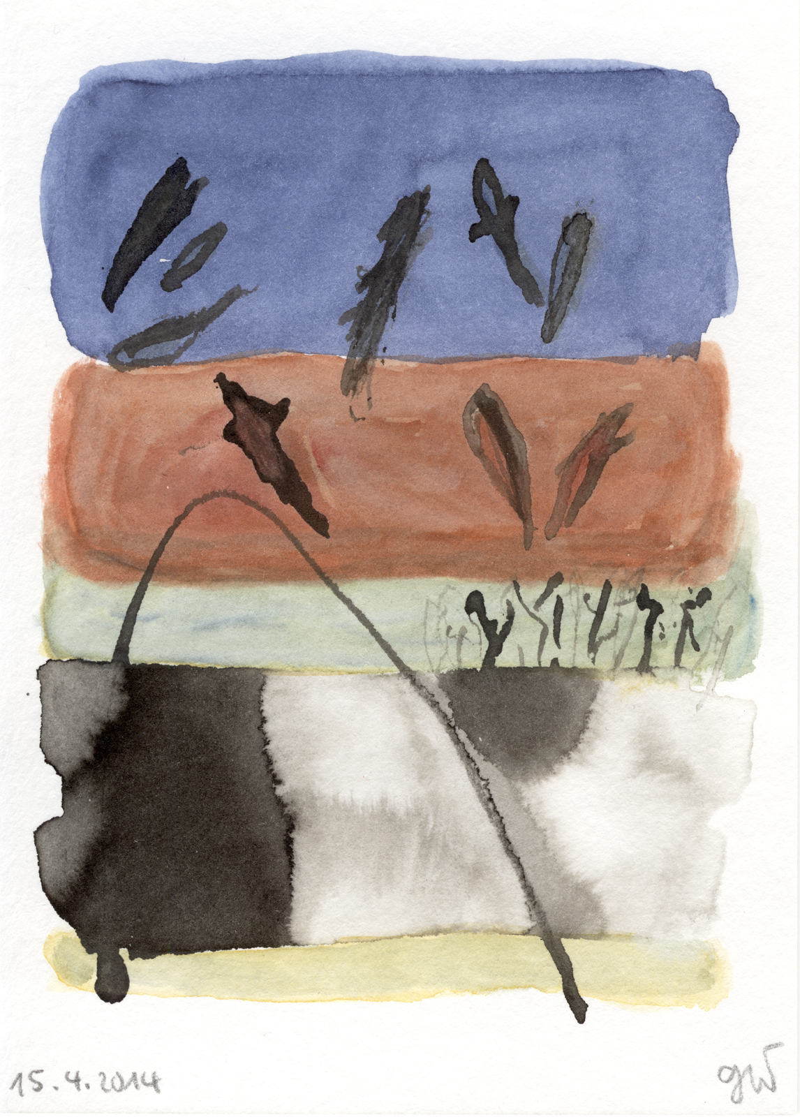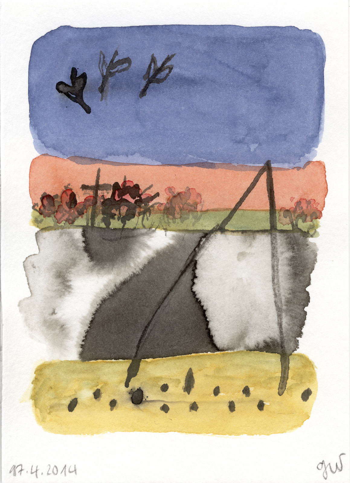 Im März/April 2014 nahm ich am Sozialkunstprojekt „Meine 40 Tagebuchaufzeichnungen in der Passionszeit“ in der Johanneskirche der Christengemeinschaft München-West teil. Die Projektleitung hatte die Kunsttherapeutin Rita Eckart. An jedem Tag entstand zur Vorübung und Motivfindung zunächst eine schwarzweiß Zeichnung mit Tusche und Rohrfeder, bevor ich das eigentliche Bild in Rohrfeder und Aquarell ausführte. Bei diesen beiden Blättern blieb es dann auch — um eine möglichst hohe Konzentration auf den Entstehungsprozess zu erreichen, erlaubte ich mir nicht, mehrere Versuche pro Tag zu machen.