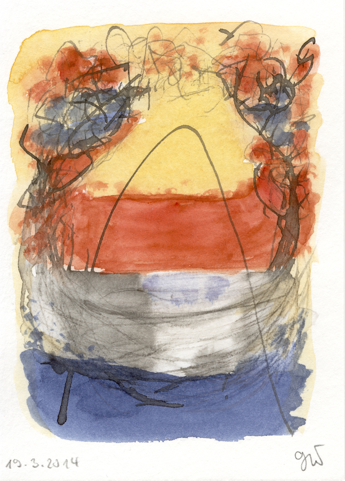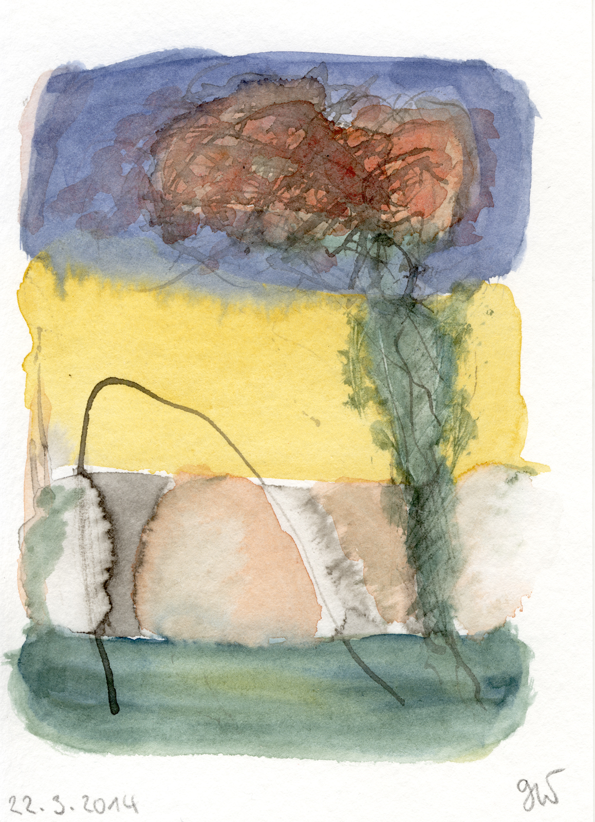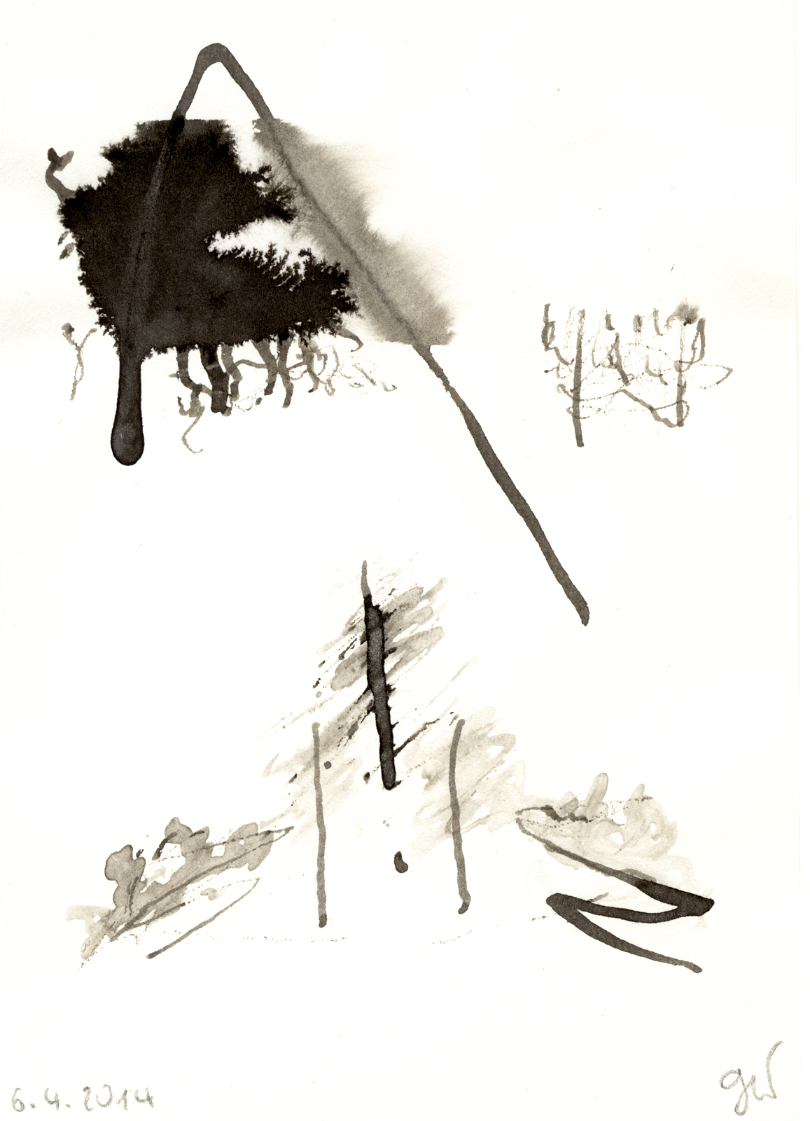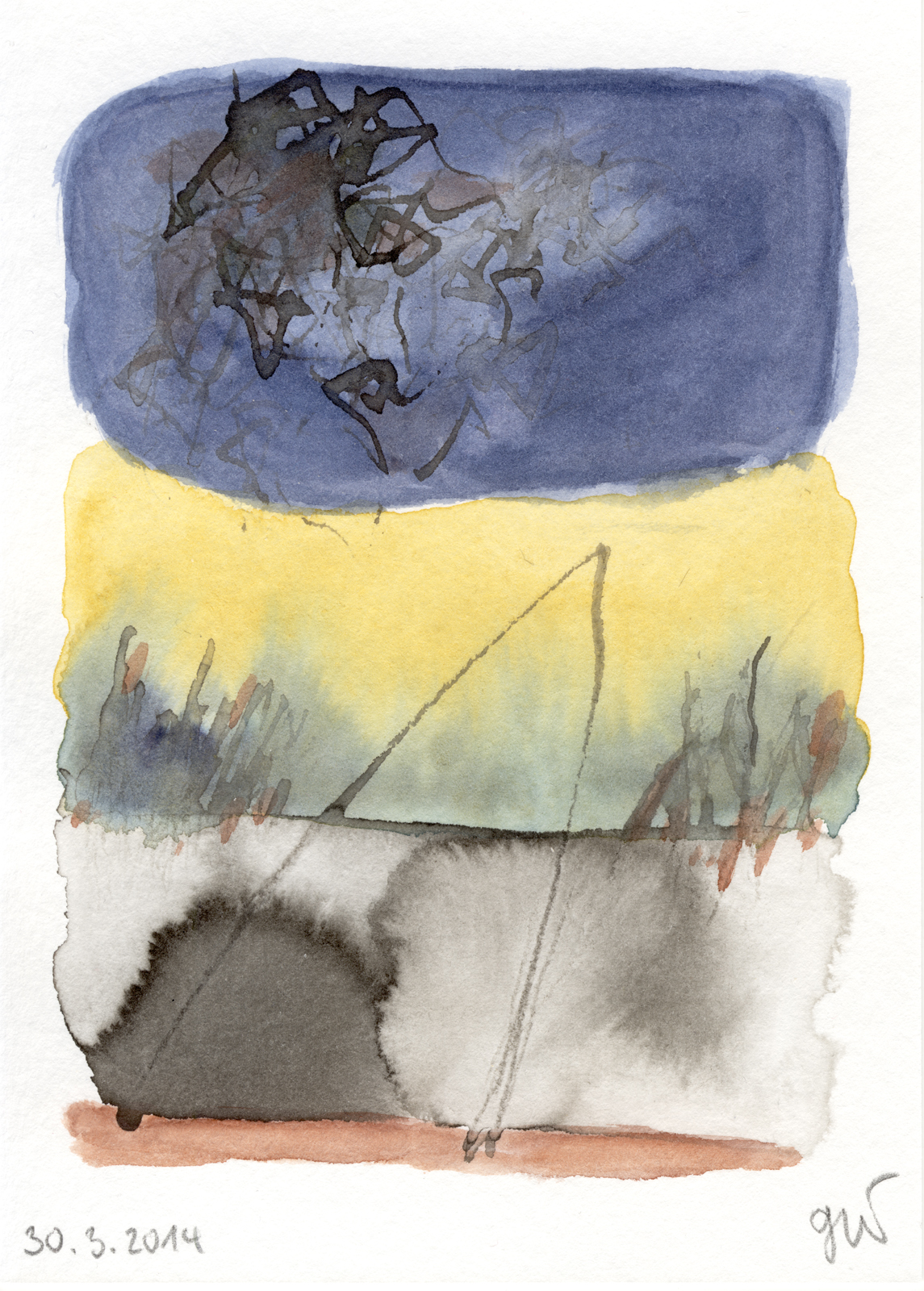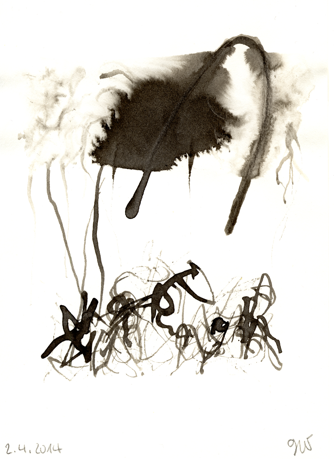Im März/April 2014 nahm ich am Sozialkunstprojekt „Meine 40 Tagebuchaufzeichnungen in der Passionszeit“ in der Johanneskirche der Christengemeinschaft München-West teil. Die Projektleitung hatte die Kunsttherapeutin Rita Eckart. An jedem Tag entstand zur Vorübung und Motivfindung zunächst eine schwarzweiß Zeichnung mit Tusche und Rohrfeder, bevor ich das eigentliche Bild in Rohrfeder und Aquarell ausführte. Bei diesen beiden Blättern blieb es dann auch — um eine möglichst hohe Konzentration auf den Entstehungsprozess zu erreichen, erlaubte ich mir nicht, mehrere Versuche pro Tag zu machen.