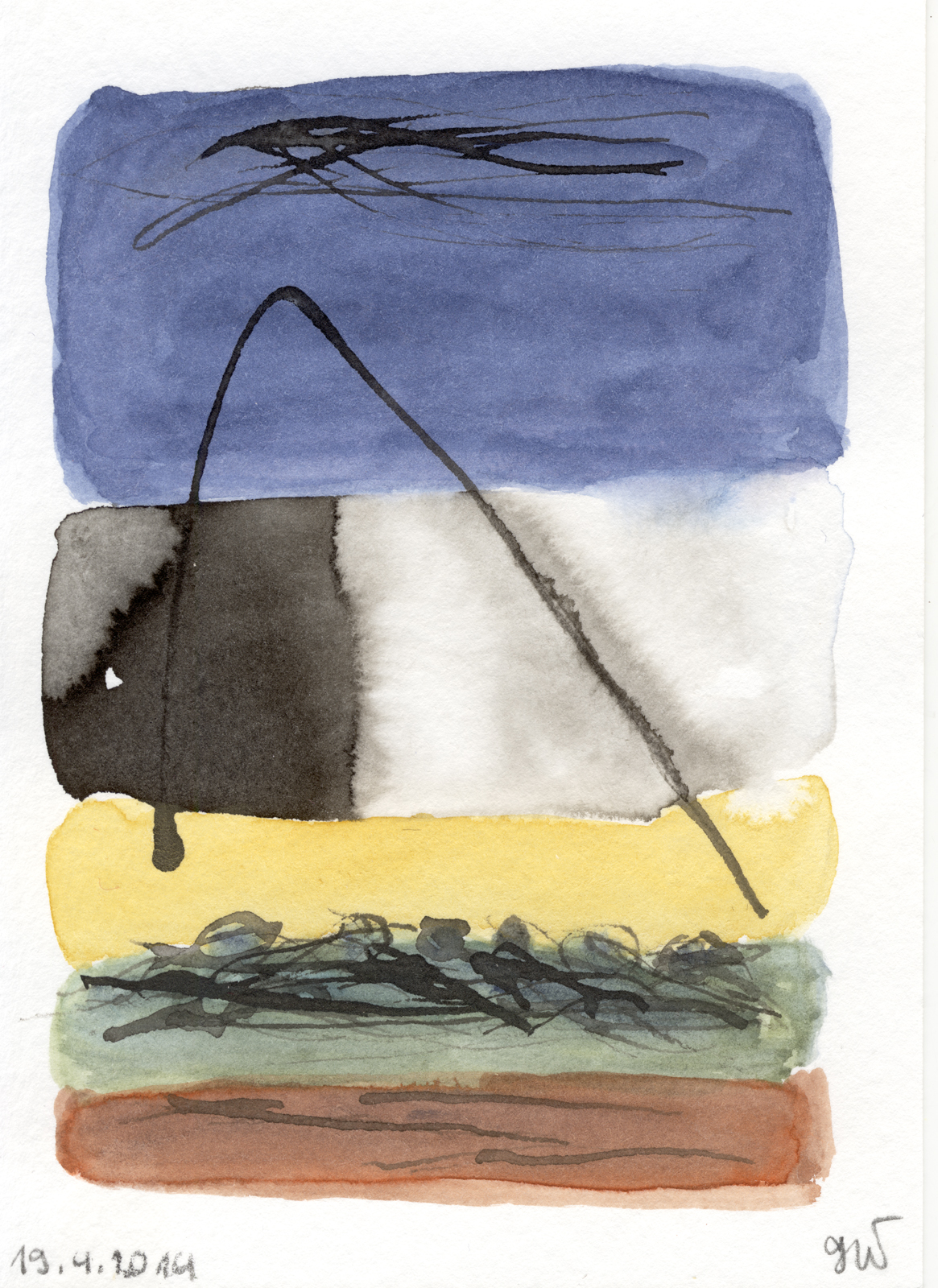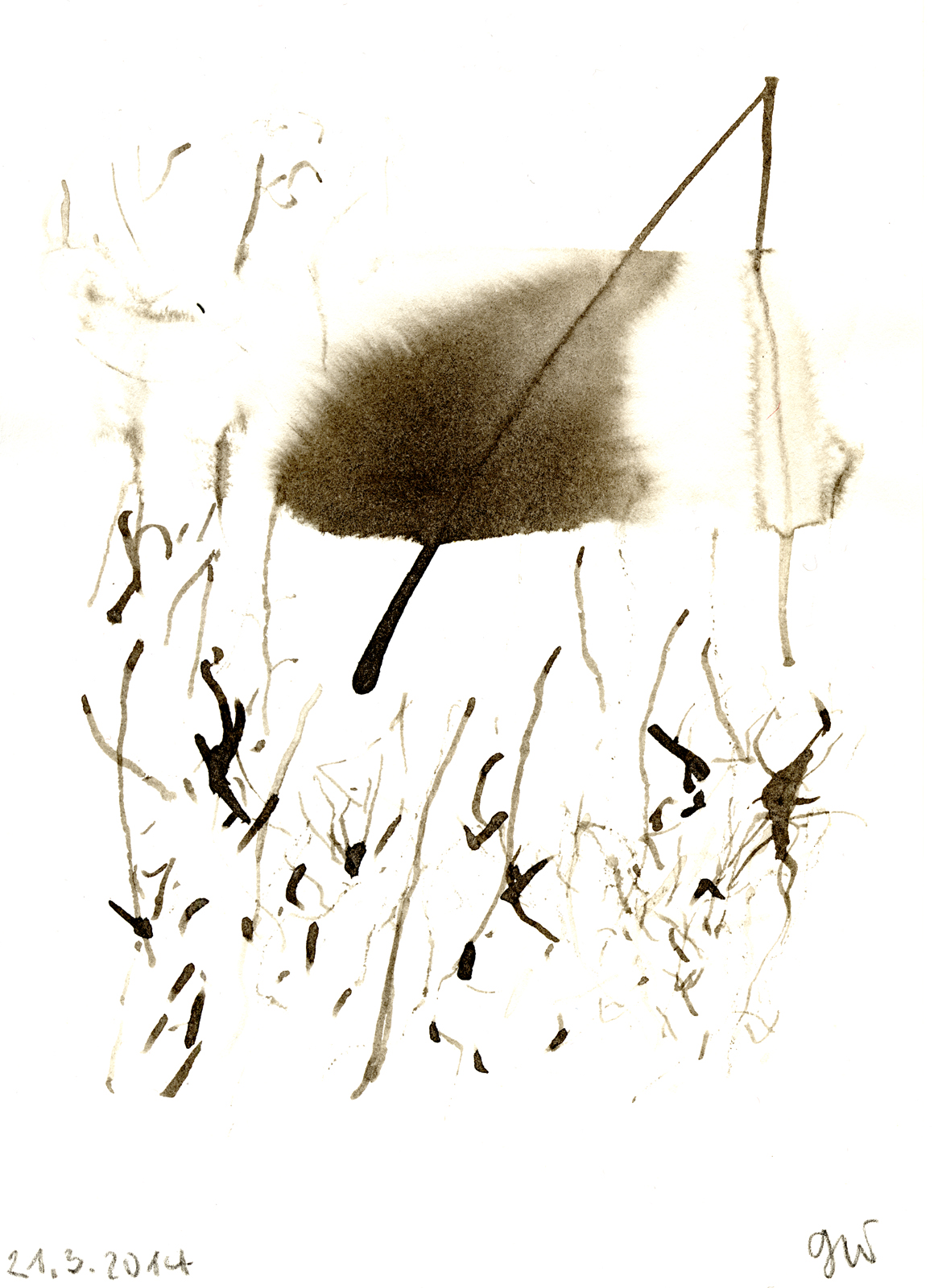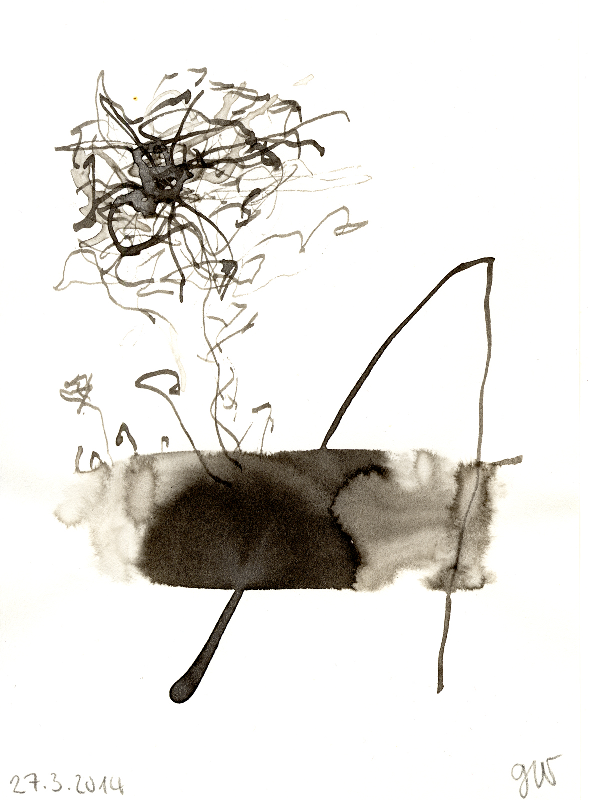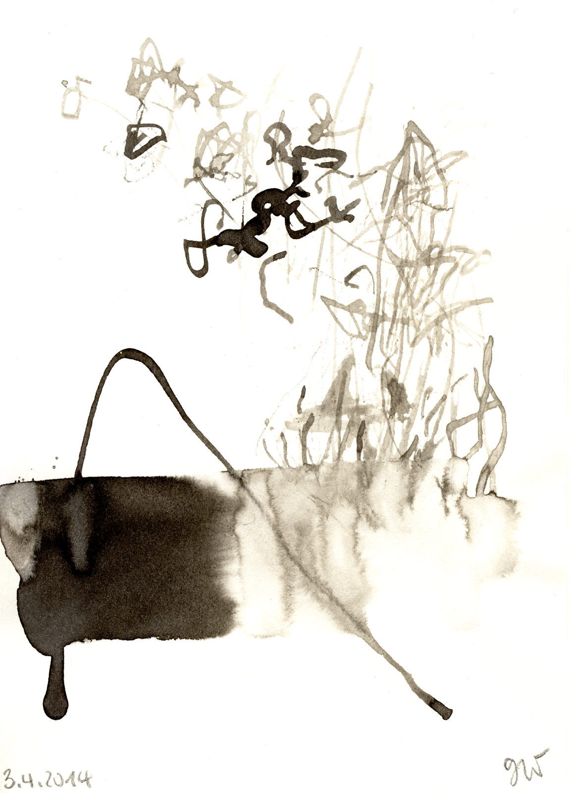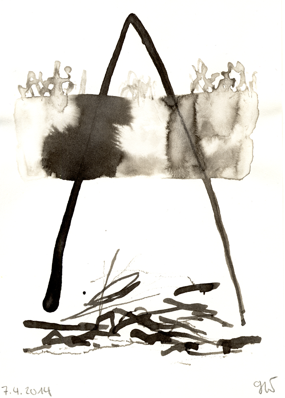 Im März/April 2014 nahm ich am Sozialkunstprojekt „Meine 40 Tagebuchaufzeichnungen in der Passionszeit“ in der Johanneskirche der Christengemeinschaft München-West teil. Die Projektleitung hatte die Kunsttherapeutin Rita Eckart. An jedem Tag entstand zur Vorübung und Motivfindung zunächst eine schwarzweiß Zeichnung mit Tusche und Rohrfeder, bevor ich das eigentliche Bild in Rohrfeder und Aquarell ausführte. Bei diesen beiden Blättern blieb es dann auch — um eine möglichst hohe Konzentration auf den Entstehungsprozess zu erreichen, erlaubte ich mir nicht, mehrere Versuche pro Tag zu machen.
