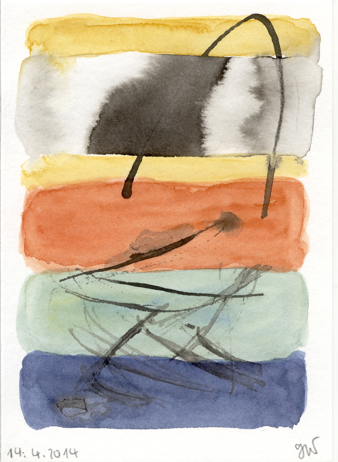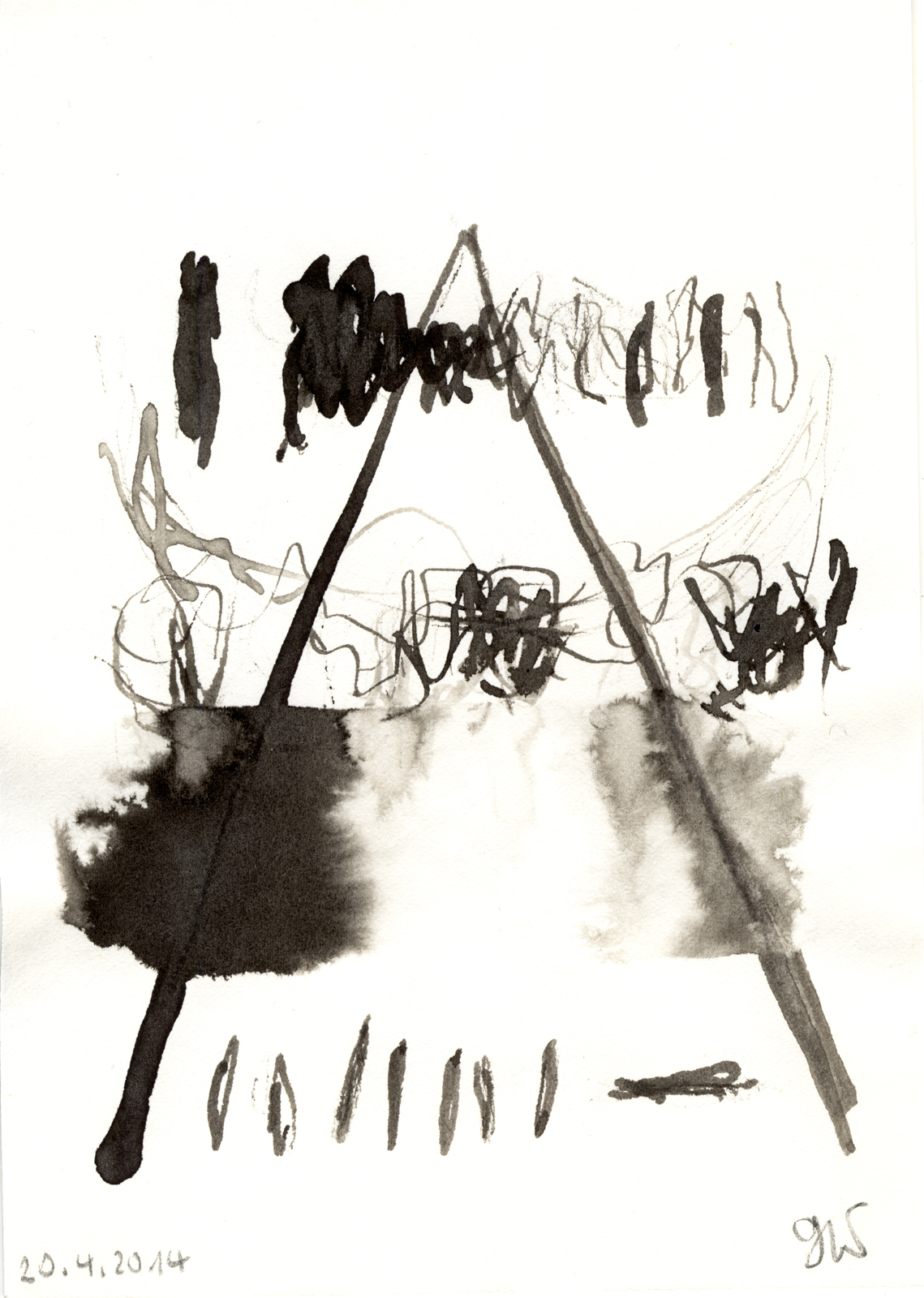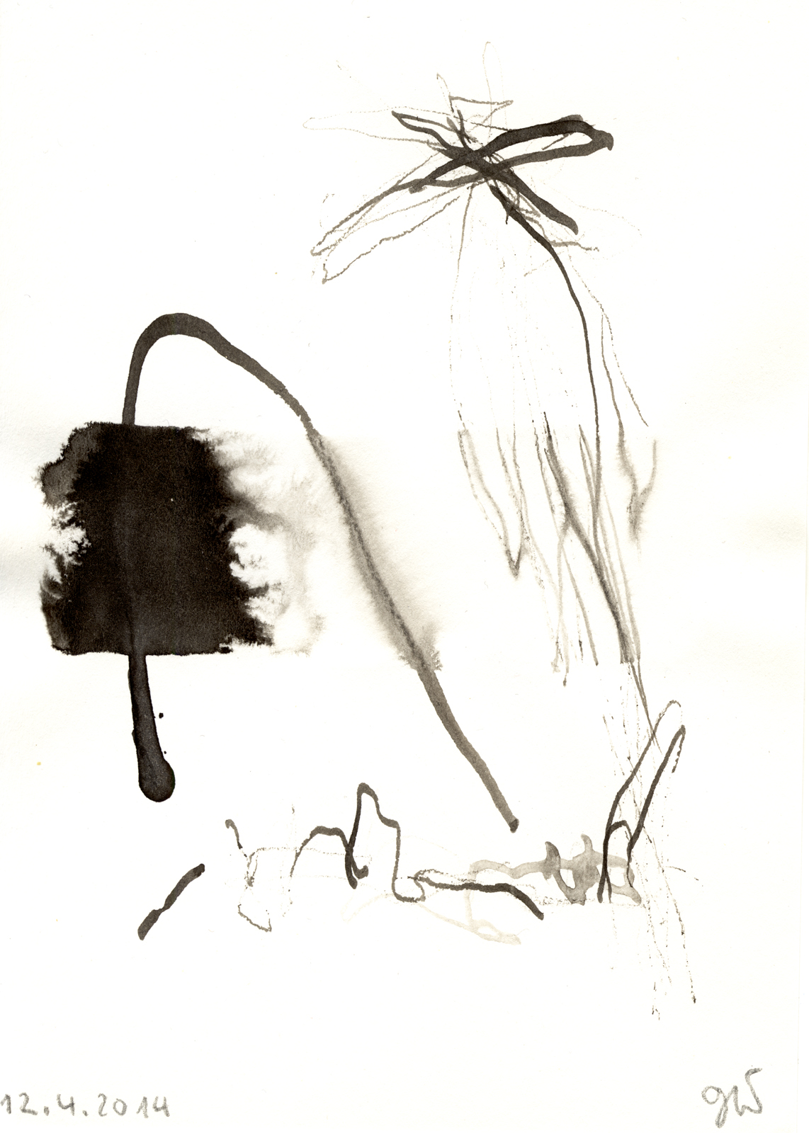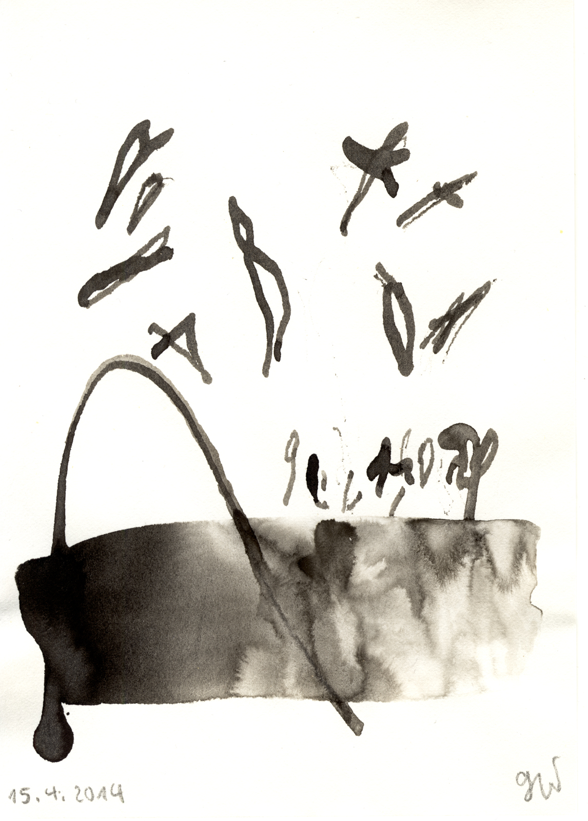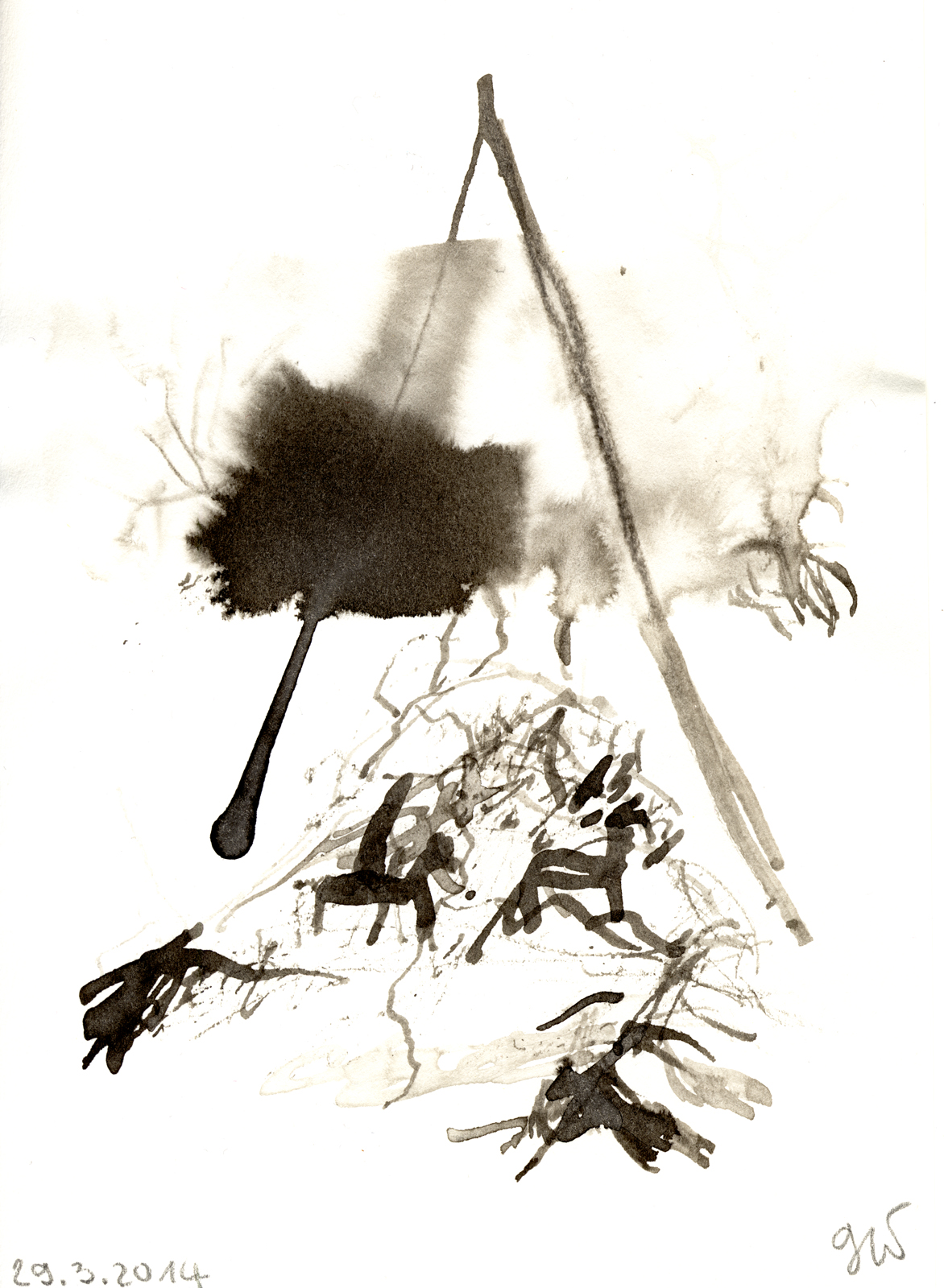 Im März/April 2014 nahm ich am Sozialkunstprojekt „Meine 40 Tagebuchaufzeichnungen in der Passionszeit“ in der Johanneskirche der Christengemeinschaft München-West teil. Die Projektleitung hatte die Kunsttherapeutin Rita Eckart. An jedem Tag entstand zur Vorübung und Motivfindung zunächst eine schwarzweiß Zeichnung mit Tusche und Rohrfeder, bevor ich das eigentliche Bild in Rohrfeder und Aquarell ausführte. Bei diesen beiden Blättern blieb es dann auch — um eine möglichst hohe Konzentration auf den Entstehungsprozess zu erreichen, erlaubte ich mir nicht, mehrere Versuche pro Tag zu machen.
