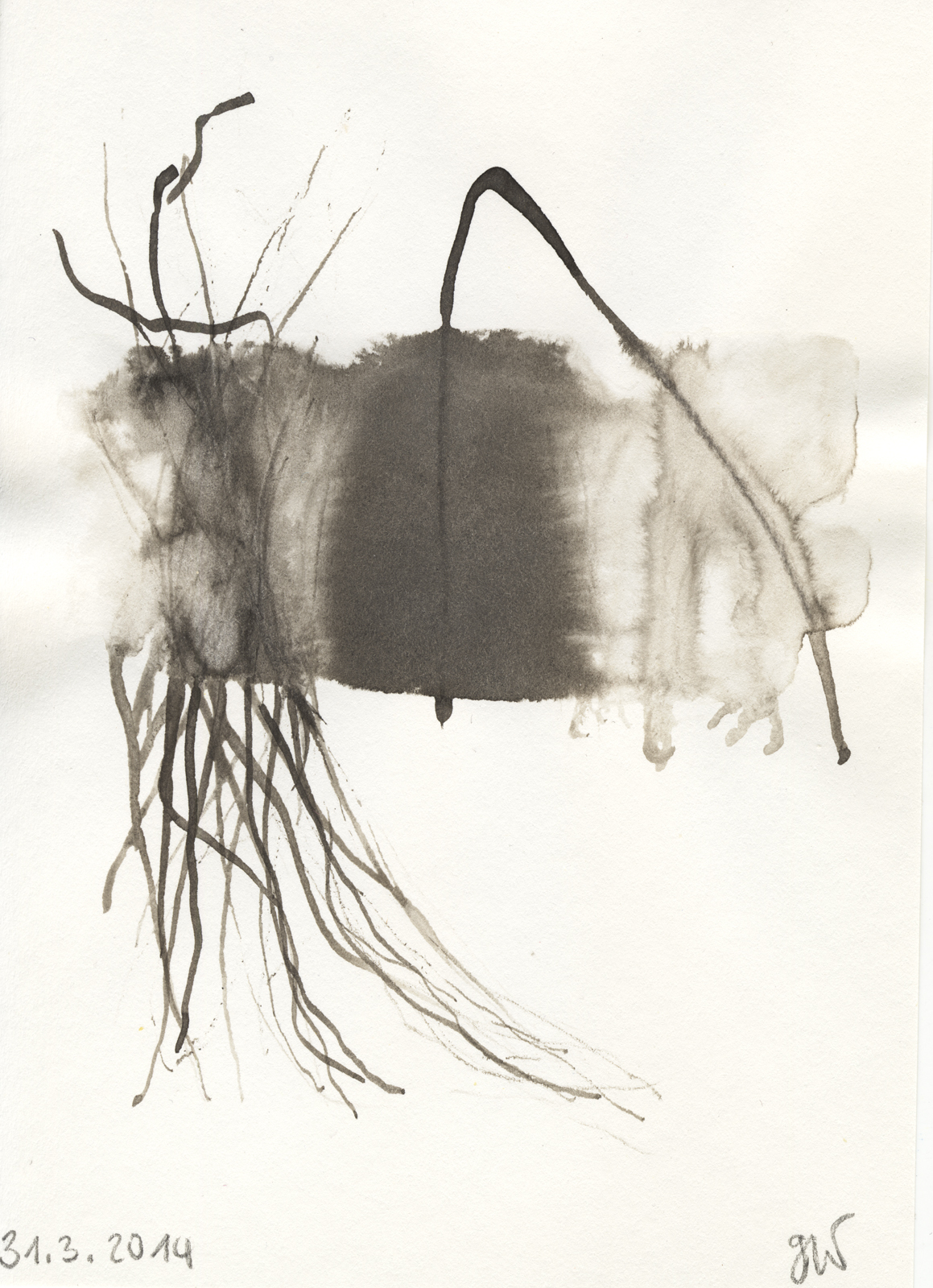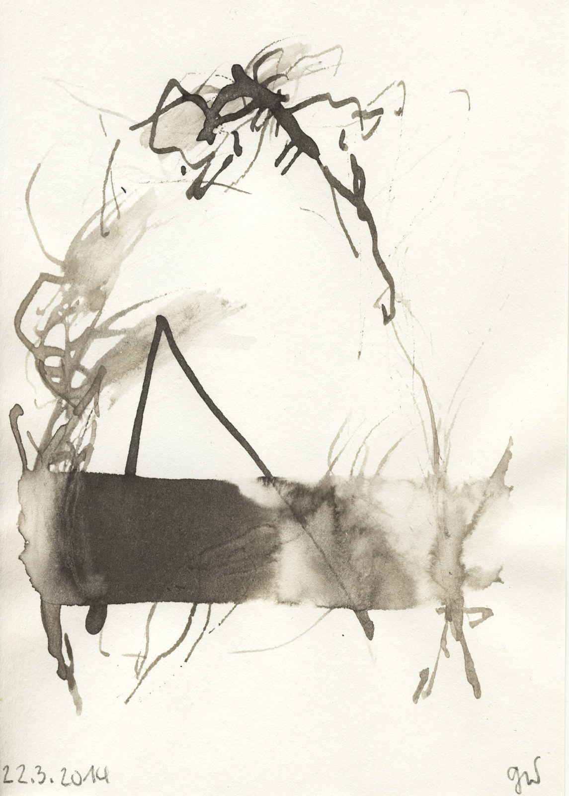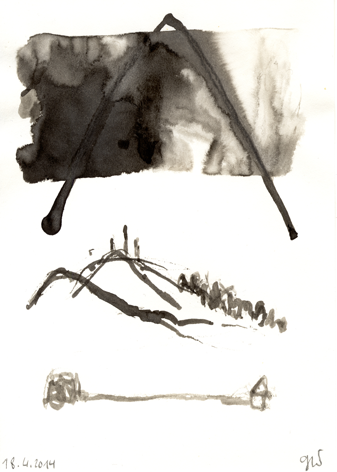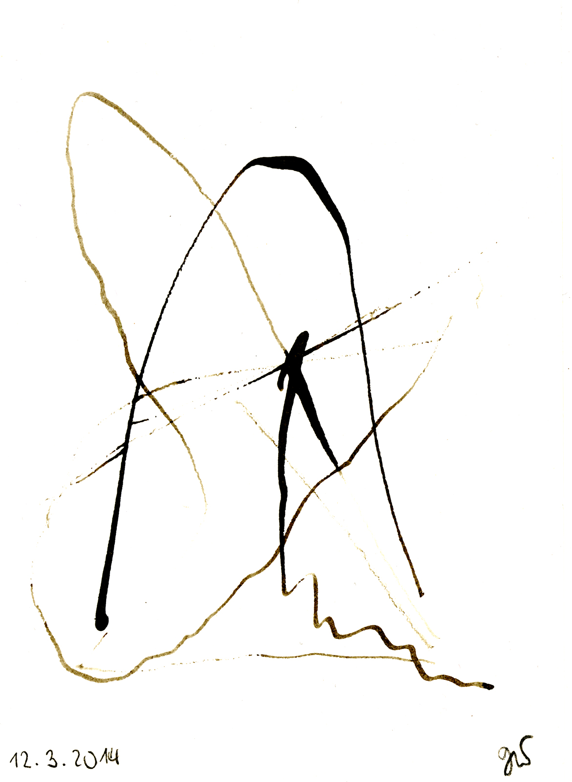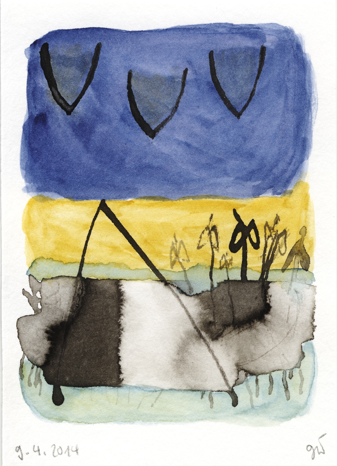 Im März/April 2014 nahm ich am Sozialkunstprojekt „Meine 40 Tagebuchaufzeichnungen in der Passionszeit“ in der Johanneskirche der Christengemeinschaft München-West teil. Die Projektleitung hatte die Kunsttherapeutin Rita Eckart. An jedem Tag entstand zur Vorübung und Motivfindung zunächst eine schwarzweiß Zeichnung mit Tusche und Rohrfeder, bevor ich das eigentliche Bild in Rohrfeder und Aquarell ausführte. Bei diesen beiden Blättern blieb es dann auch — um eine möglichst hohe Konzentration auf den Entstehungsprozess zu erreichen, erlaubte ich mir nicht, mehrere Versuche pro Tag zu machen.