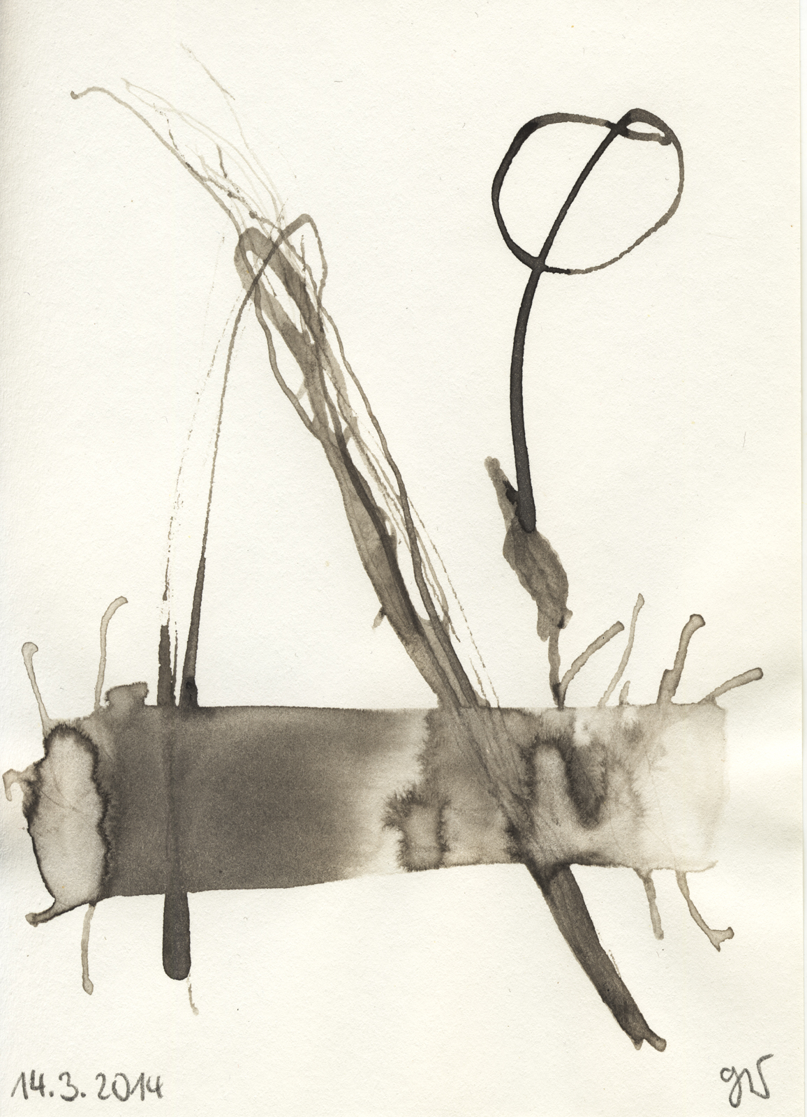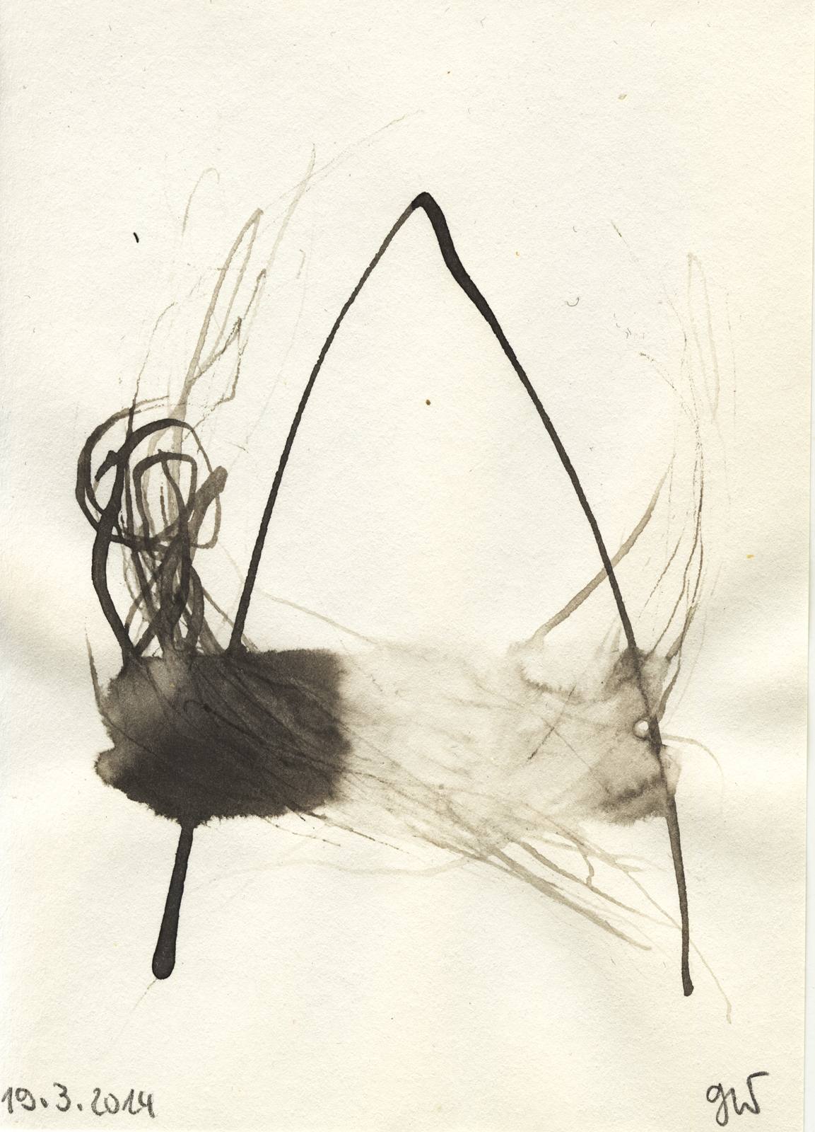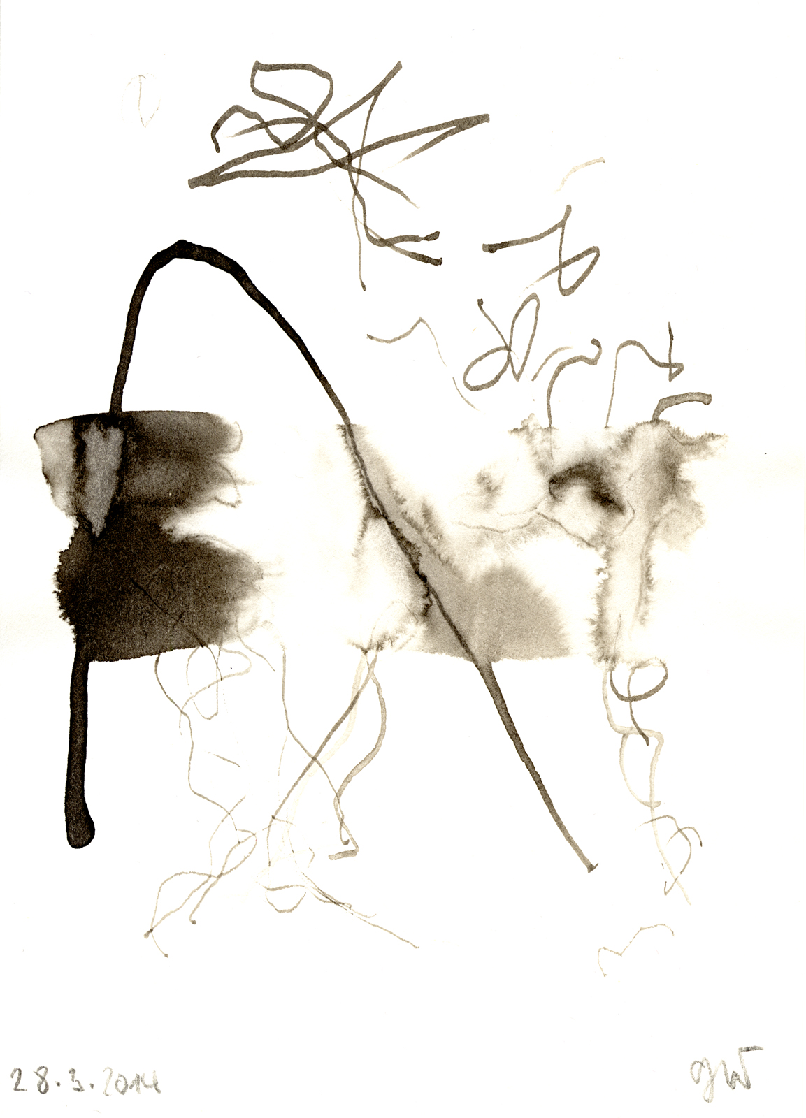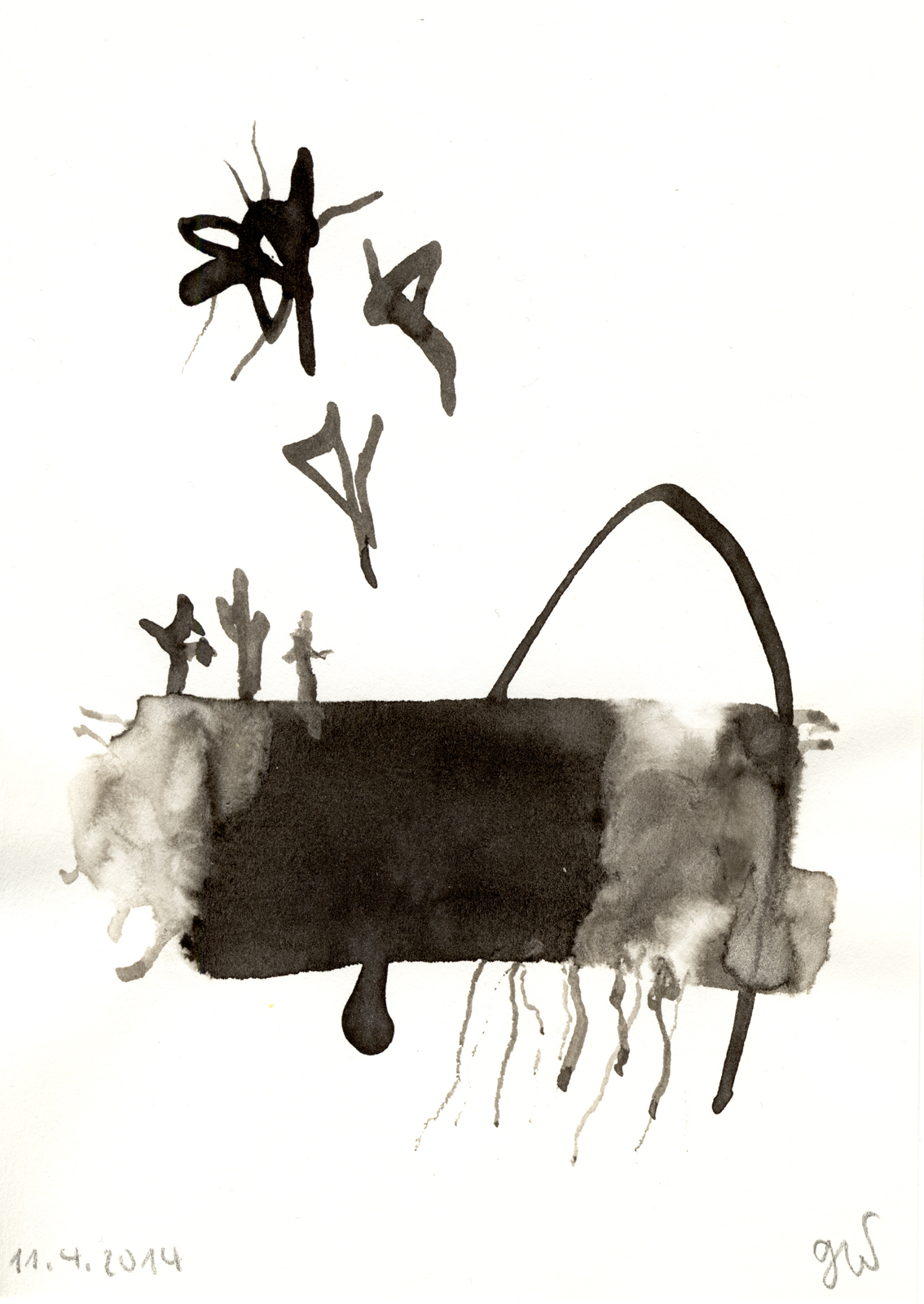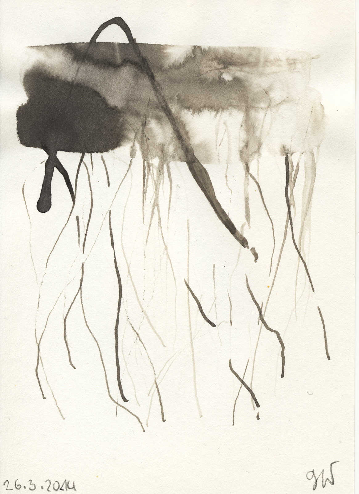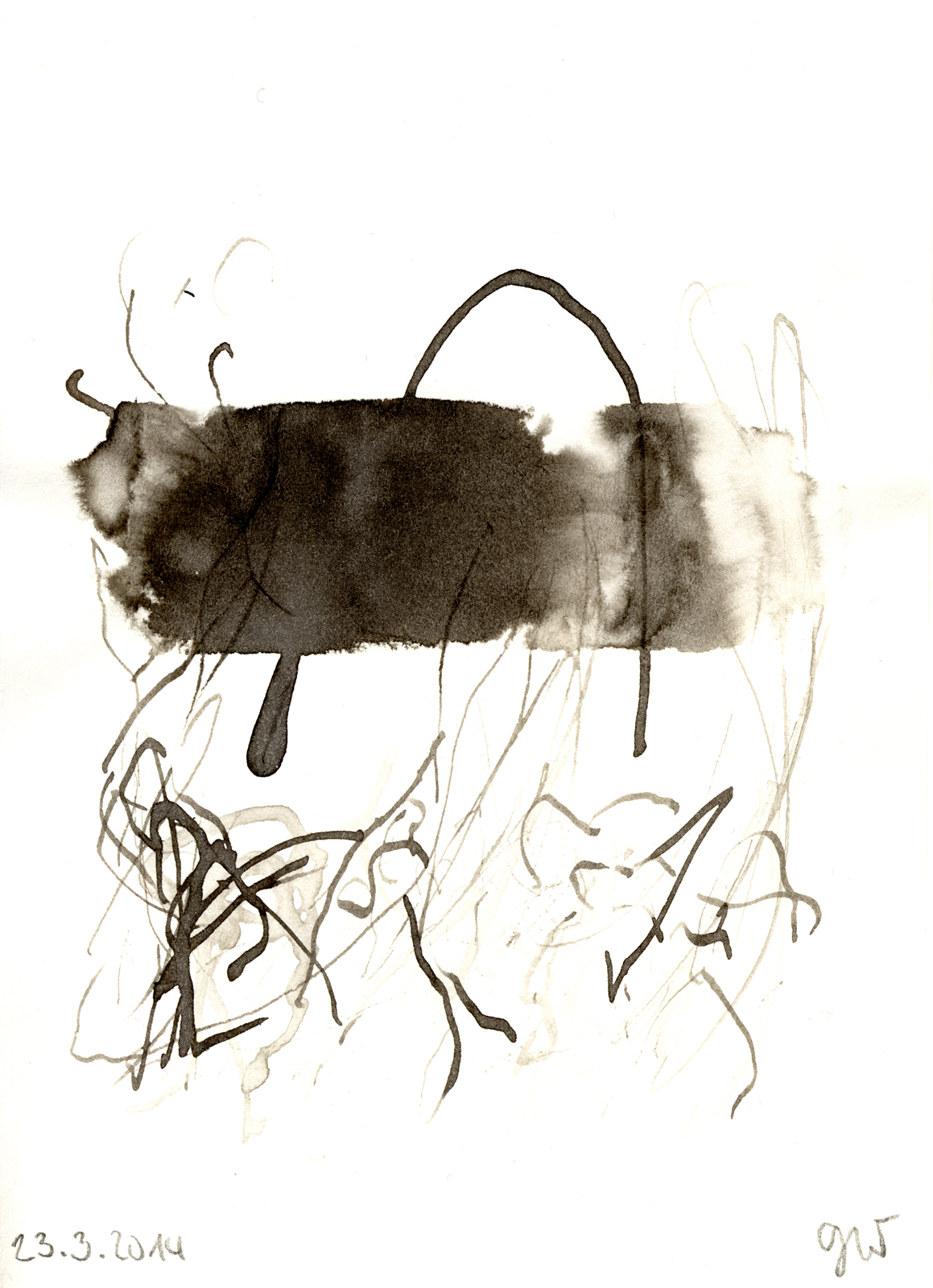 Im März/April 2014 nahm ich am Sozialkunstprojekt „Meine 40 Tagebuchaufzeichnungen in der Passionszeit“ in der Johanneskirche der Christengemeinschaft München-West teil. Die Projektleitung hatte die Kunsttherapeutin Rita Eckart. An jedem Tag entstand zur Vorübung und Motivfindung zunächst eine schwarzweiß Zeichnung mit Tusche und Rohrfeder, bevor ich das eigentliche Bild in Rohrfeder und Aquarell ausführte. Bei diesen beiden Blättern blieb es dann auch — um eine möglichst hohe Konzentration auf den Entstehungsprozess zu erreichen, erlaubte ich mir nicht, mehrere Versuche pro Tag zu machen.
