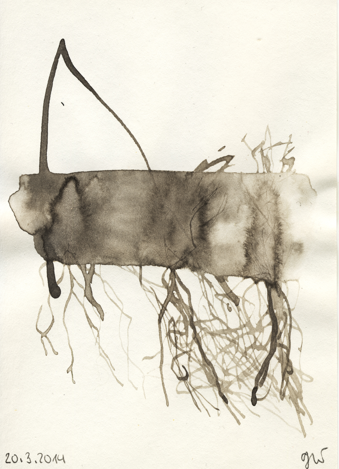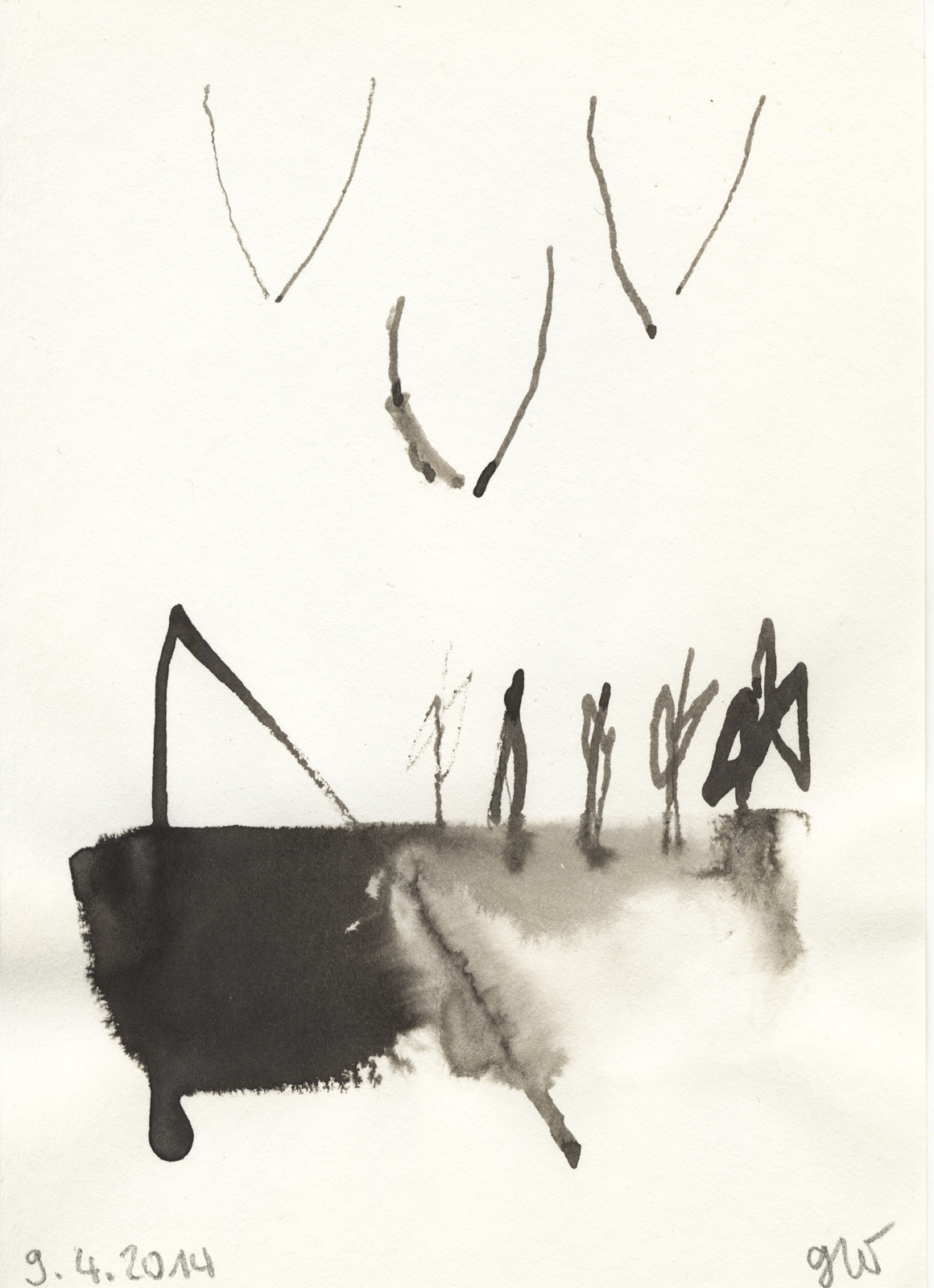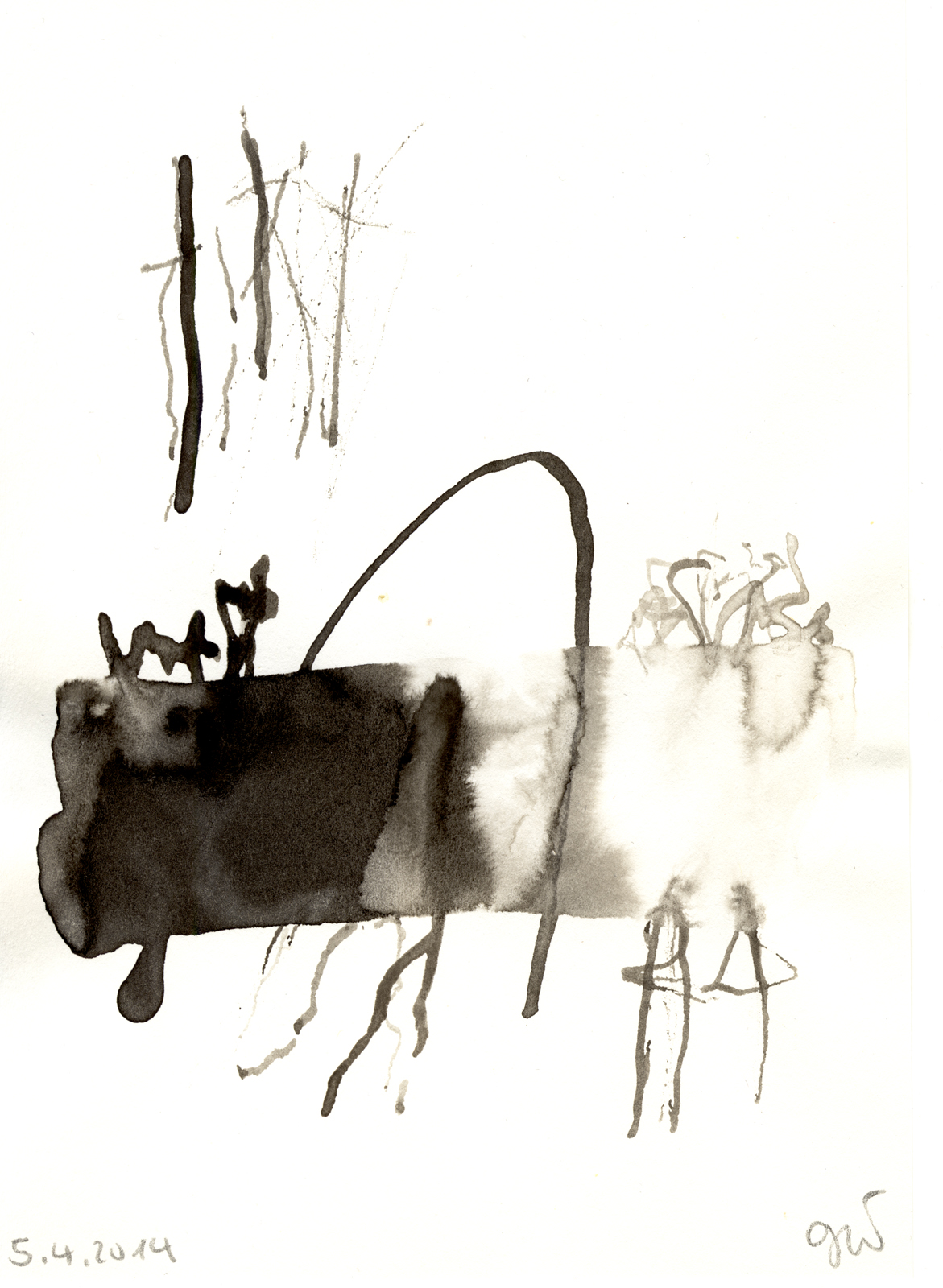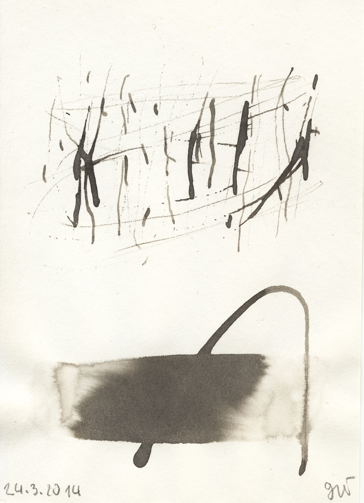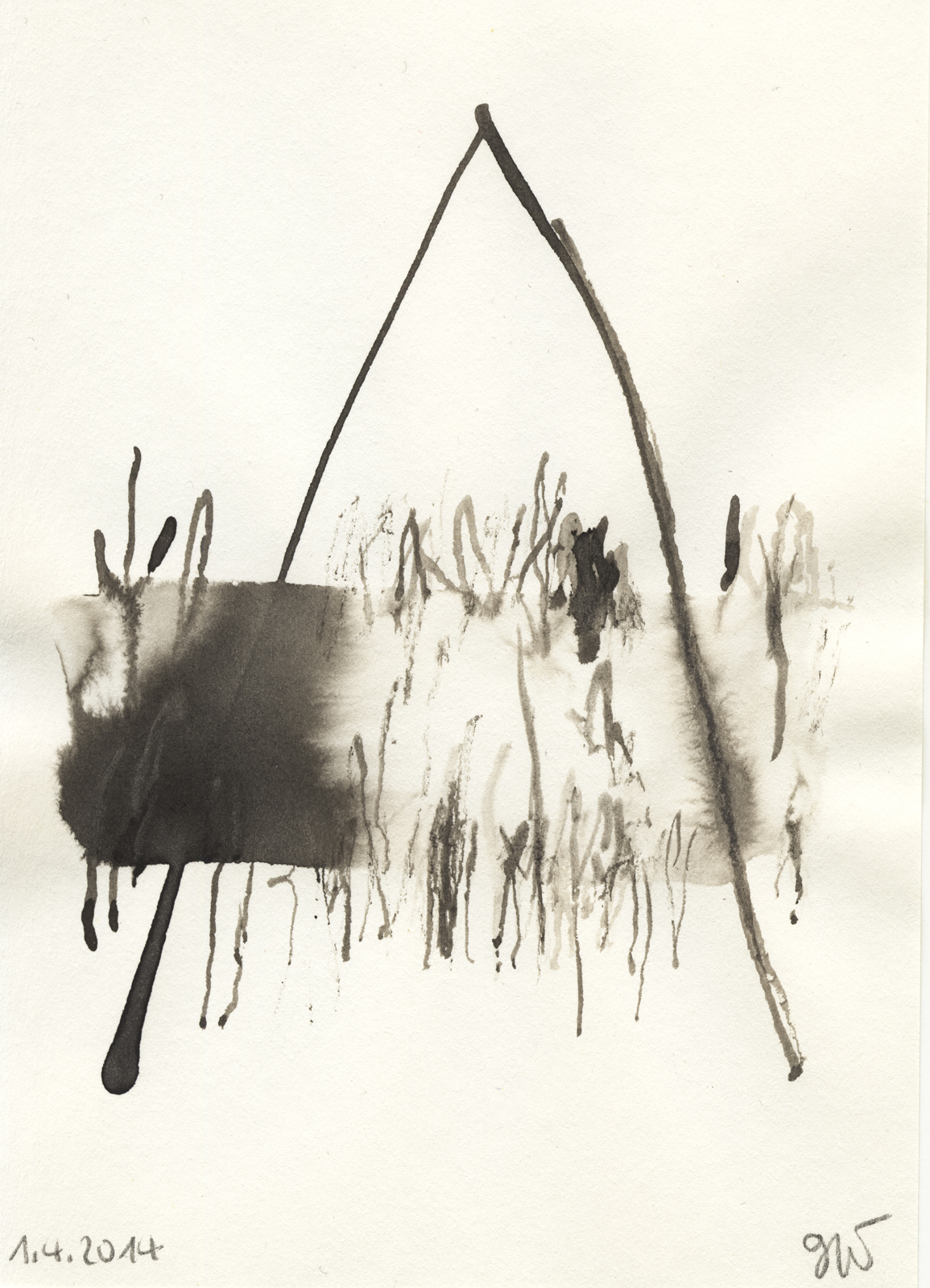 Im März/April 2014 nahm ich am Sozialkunstprojekt „Meine 40 Tagebuchaufzeichnungen in der Passionszeit“ in der Johanneskirche der Christengemeinschaft München-West teil. Die Projektleitung hatte die Kunsttherapeutin Rita Eckart. An jedem Tag entstand zur Vorübung und Motivfindung zunächst eine schwarzweiß Zeichnung mit Tusche und Rohrfeder, bevor ich das eigentliche Bild in Rohrfeder und Aquarell ausführte. Bei diesen beiden Blättern blieb es dann auch — um eine möglichst hohe Konzentration auf den Entstehungsprozess zu erreichen, erlaubte ich mir nicht, mehrere Versuche pro Tag zu machen.