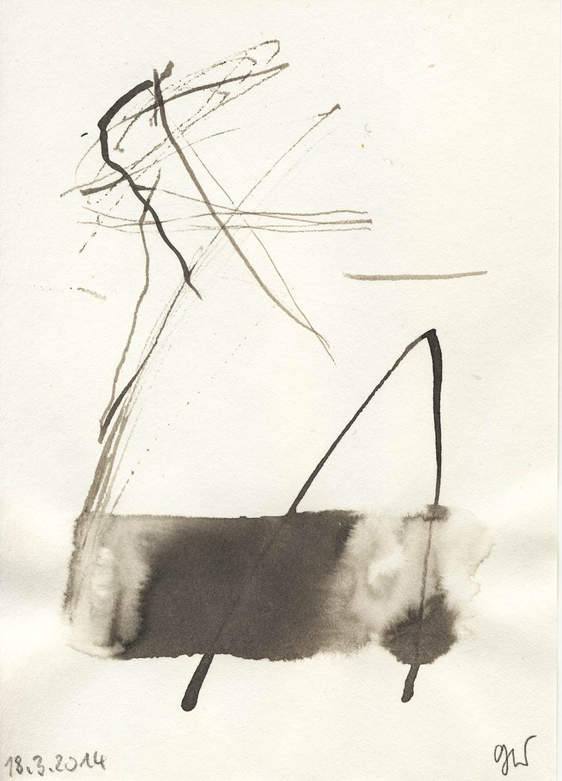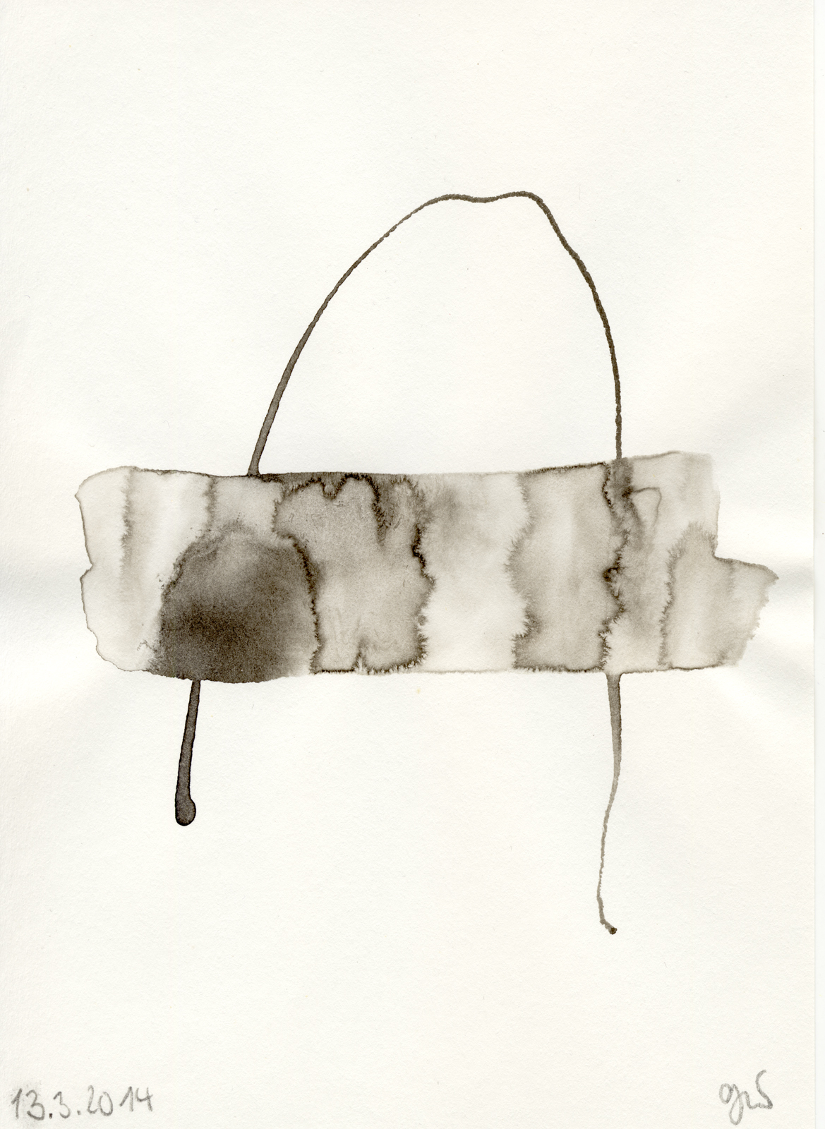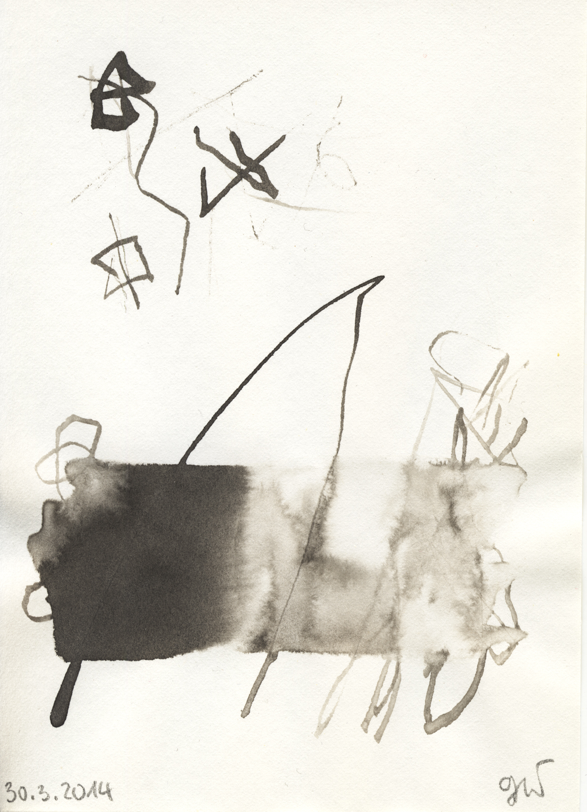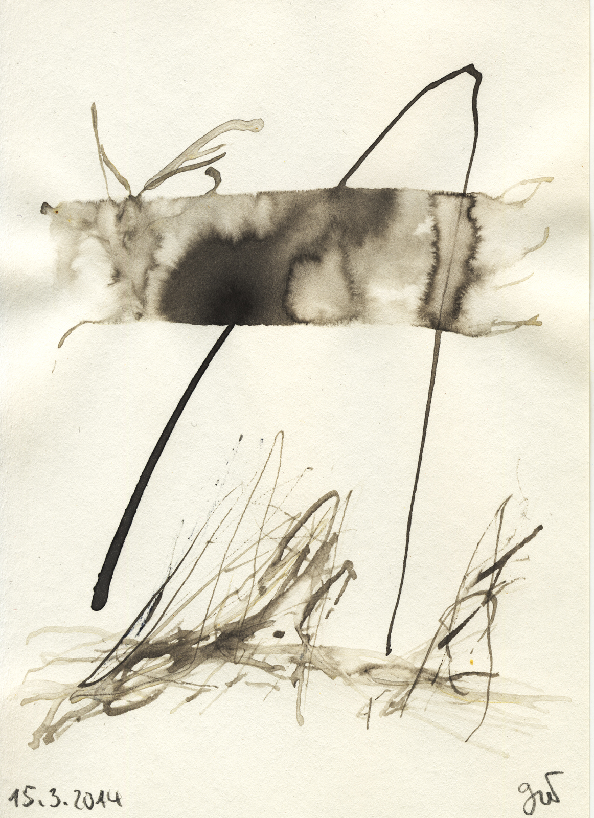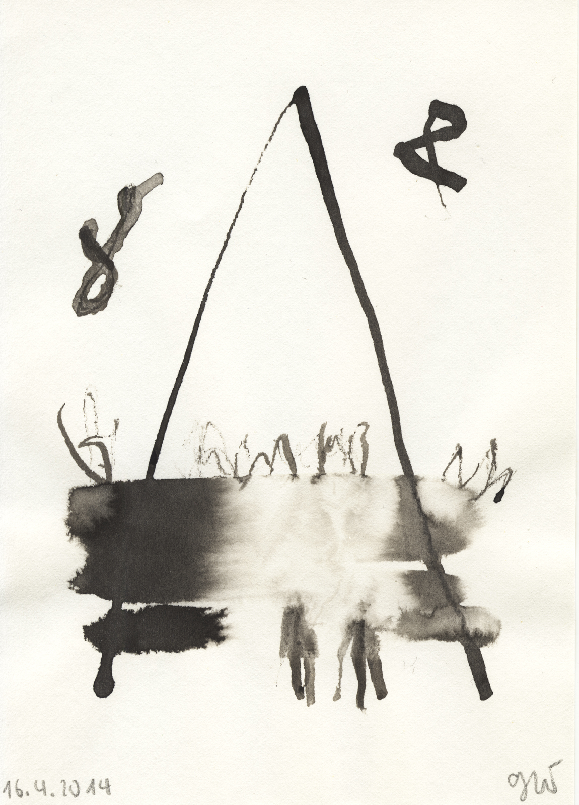 Im März/April 2014 nahm ich am Sozialkunstprojekt „Meine 40 Tagebuchaufzeichnungen in der Passionszeit“ in der Johanneskirche der Christengemeinschaft München-West teil. Die Projektleitung hatte die Kunsttherapeutin Rita Eckart. An jedem Tag entstand zur Vorübung und Motivfindung zunächst eine schwarzweiß Zeichnung mit Tusche und Rohrfeder, bevor ich das eigentliche Bild in Rohrfeder und Aquarell ausführte. Bei diesen beiden Blättern blieb es dann auch — um eine möglichst hohe Konzentration auf den Entstehungsprozess zu erreichen, erlaubte ich mir nicht, mehrere Versuche pro Tag zu machen.