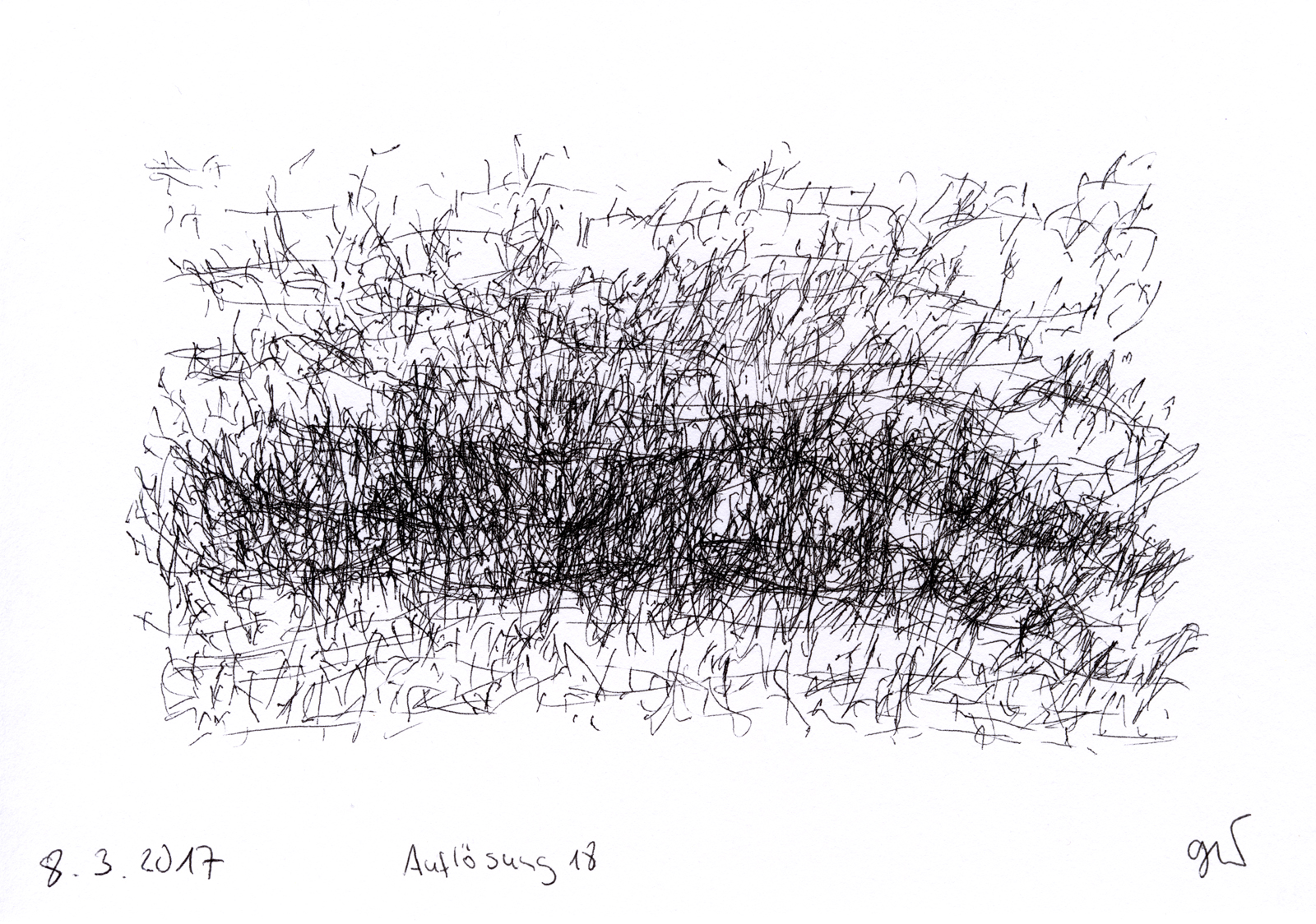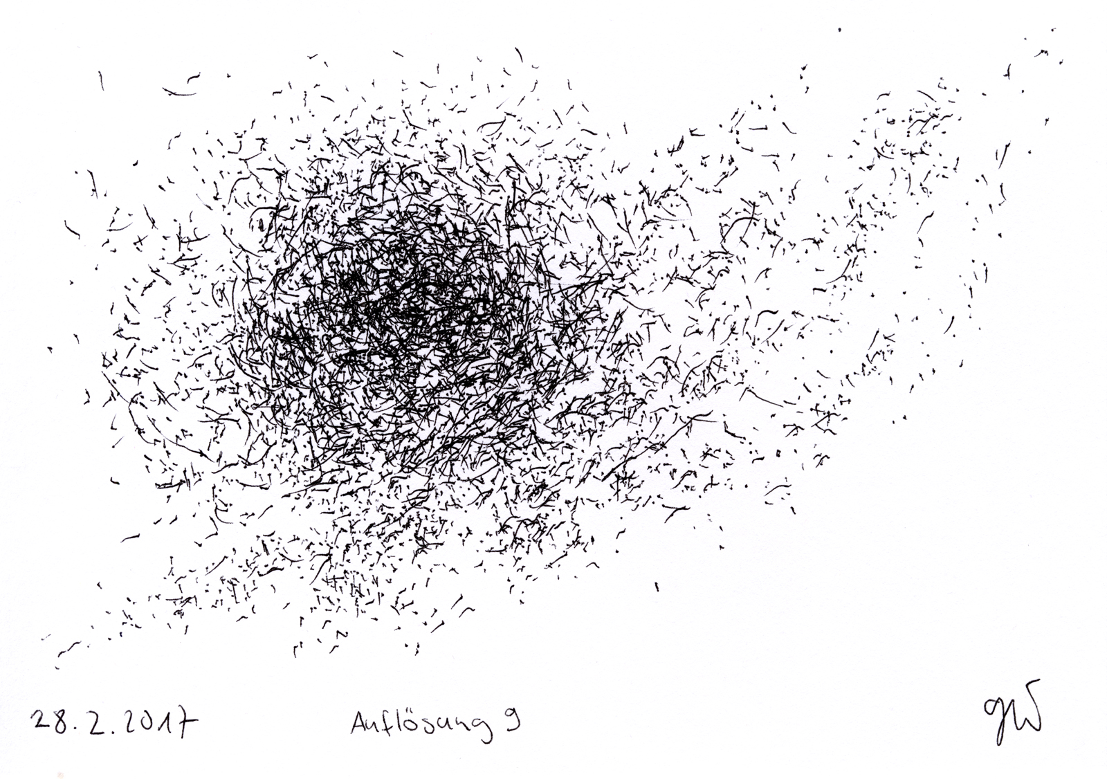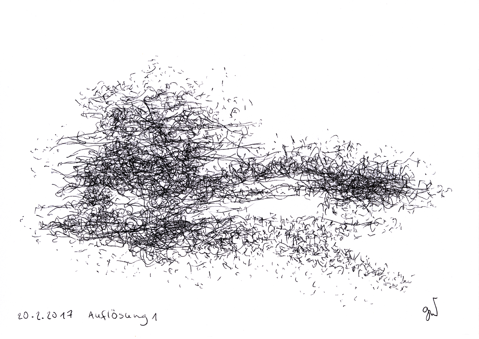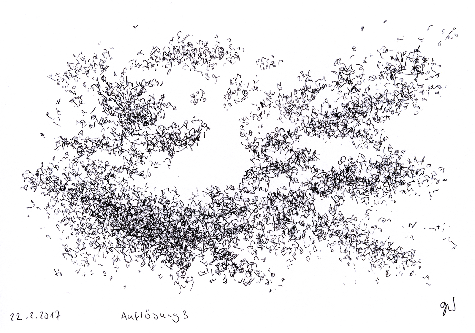 Am 20. Februar 2017, vier Jahre und vier Monate nach dem Tod unseres Sohnes Albert, dachte ich über seinen Körper unter der Erde nach. Wie sehr mochte er sich schon aufgelöst haben, in seiner Umgebung versunken sein? Mit diesen Gedanken machte ich eine erste Zeichnung. Während ich an weiteren Bildern arbeitete, bewegte ich innerlich den Begriff Auflösung: Auflösung von anderen Flüssigkeiten in Wasser, im Meer — von Gasen in Luft — von Wolken am Himmel — durch eine Explosion — bei organischen Prozessen, wie Verwelken von Pflanzen, Verderben von Lebensmitteln — einer Menschenmenge — als Ende einer Beziehung — als Vergessen — als Verwandlung oder Verschwinden. Und immer wieder kehrte ich zu Albert zurück…