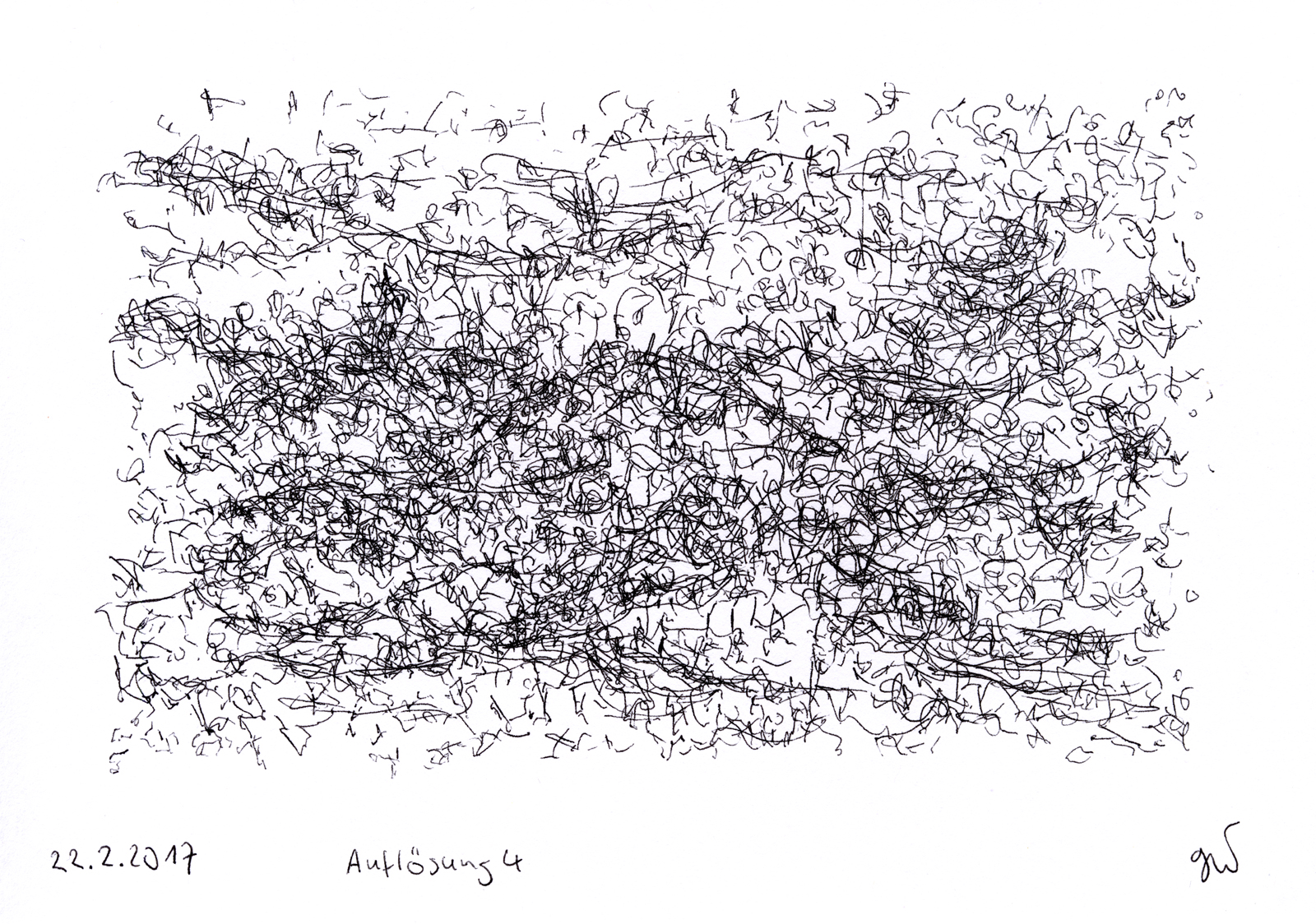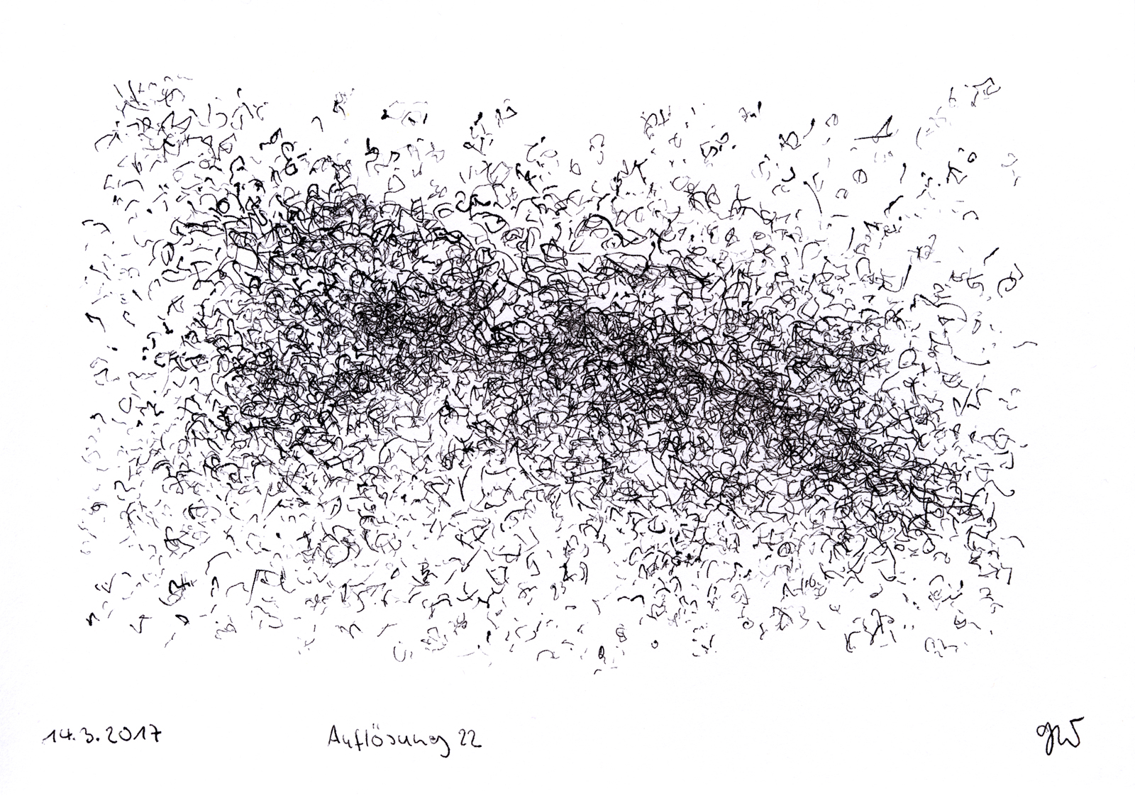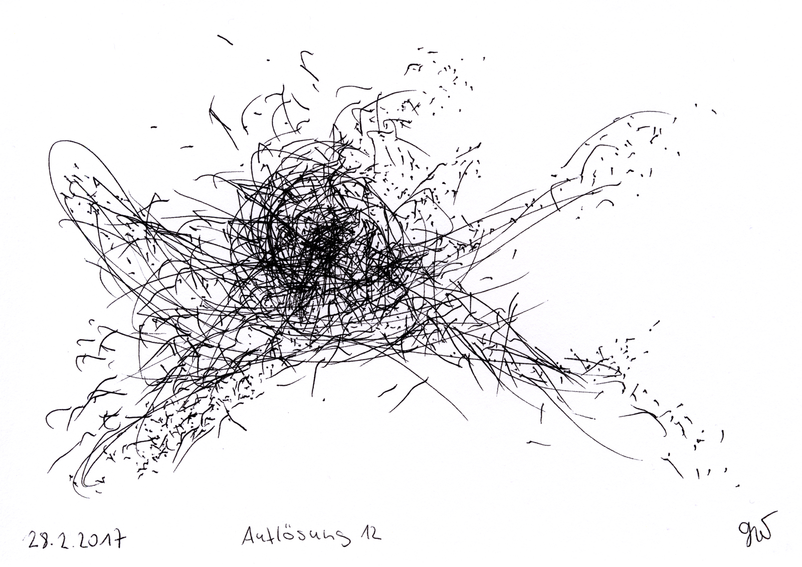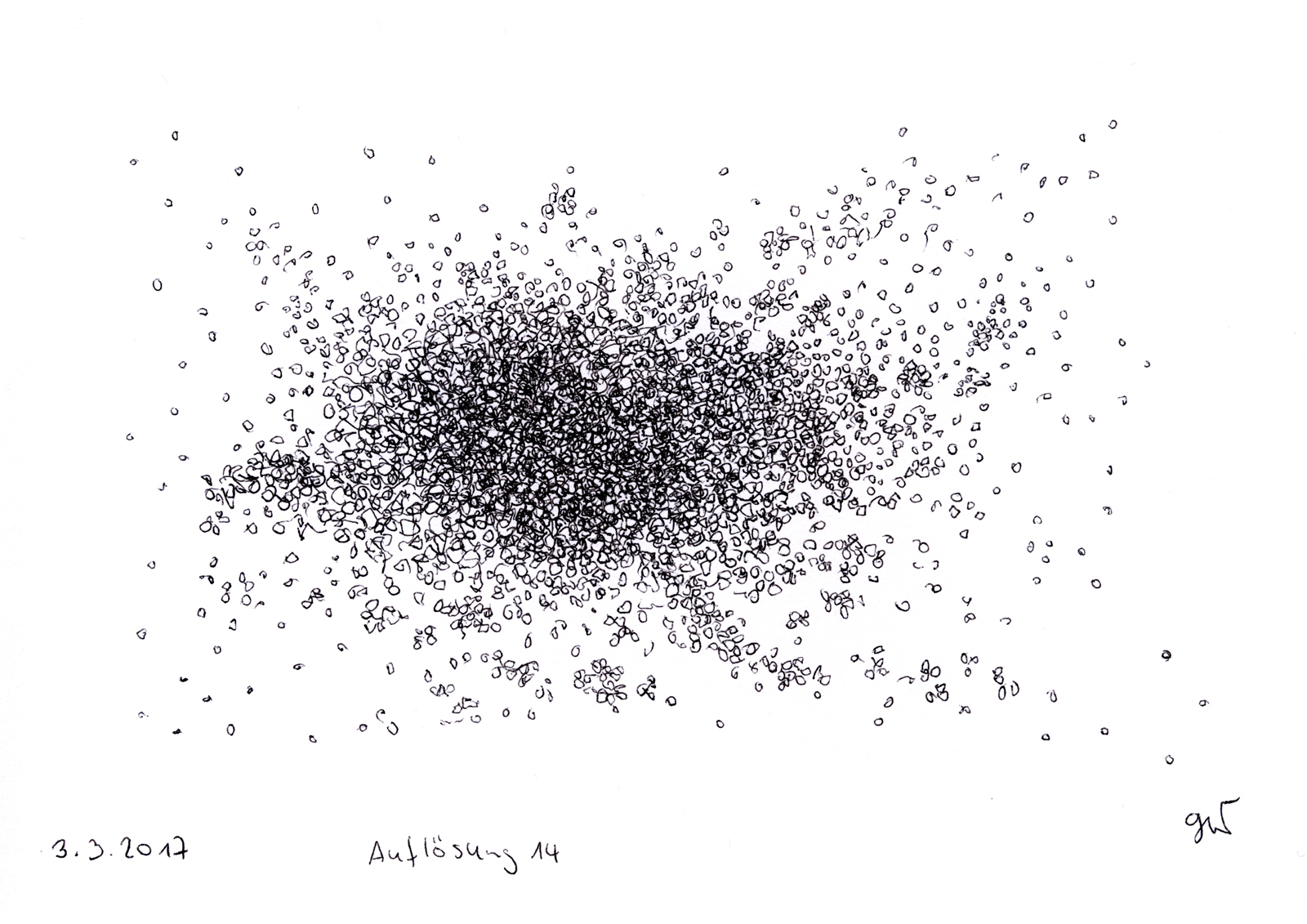 Am 20. Februar 2017, vier Jahre und vier Monate nach dem Tod unseres Sohnes Albert, dachte ich über seinen Körper unter der Erde nach. Wie sehr mochte er sich schon aufgelöst haben, in seiner Umgebung versunken sein? Mit diesen Gedanken machte ich eine erste Zeichnung. Während ich an weiteren Bildern arbeitete, bewegte ich innerlich den Begriff Auflösung: Auflösung von anderen Flüssigkeiten in Wasser, im Meer — von Gasen in Luft — von Wolken am Himmel — durch eine Explosion — bei organischen Prozessen, wie Verwelken von Pflanzen, Verderben von Lebensmitteln — einer Menschenmenge — als Ende einer Beziehung — als Vergessen — als Verwandlung oder Verschwinden. Und immer wieder kehrte ich zu Albert zurück…