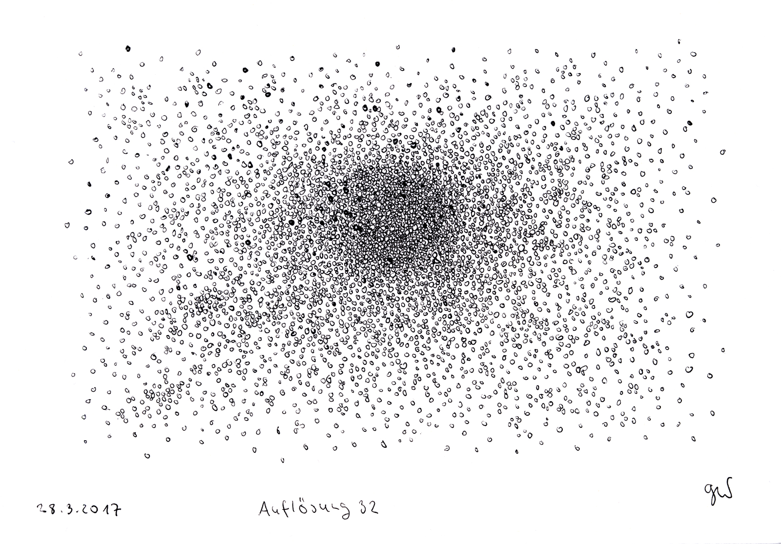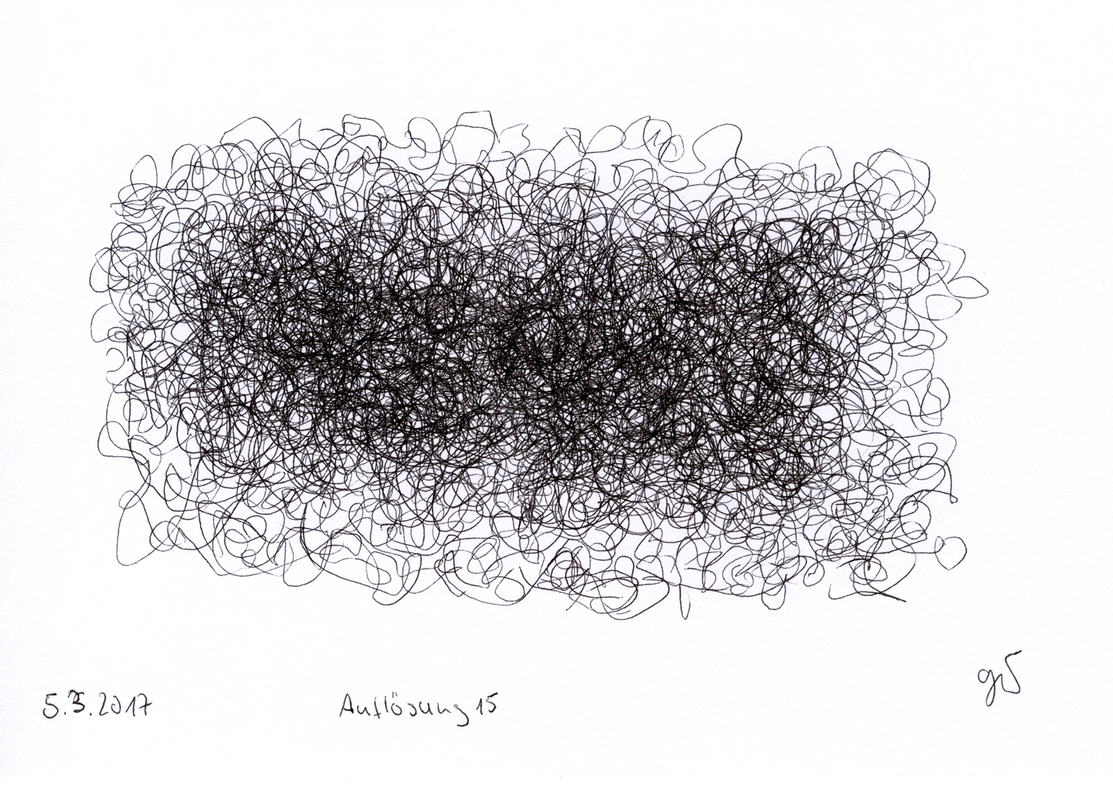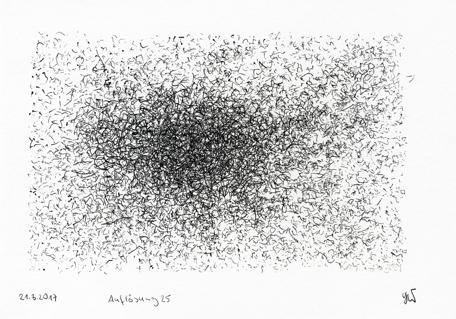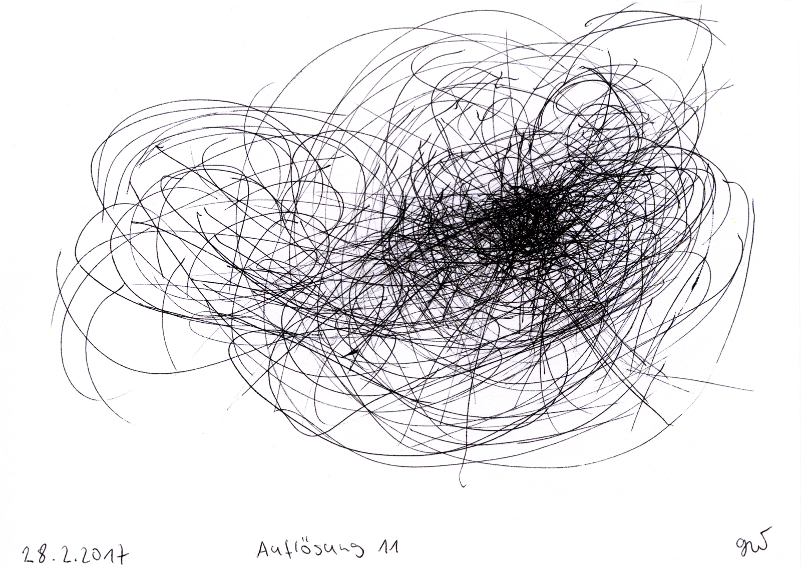 Am 20. Februar 2017, vier Jahre und vier Monate nach dem Tod unseres Sohnes Albert, dachte ich über seinen Körper unter der Erde nach. Wie sehr mochte er sich schon aufgelöst haben, in seiner Umgebung versunken sein? Mit diesen Gedanken machte ich eine erste Zeichnung. Während ich an weiteren Bildern arbeitete, bewegte ich innerlich den Begriff Auflösung: Auflösung von anderen Flüssigkeiten in Wasser, im Meer — von Gasen in Luft — von Wolken am Himmel — durch eine Explosion — bei organischen Prozessen, wie Verwelken von Pflanzen, Verderben von Lebensmitteln — einer Menschenmenge — als Ende einer Beziehung — als Vergessen — als Verwandlung oder Verschwinden. Und immer wieder kehrte ich zu Albert zurück…