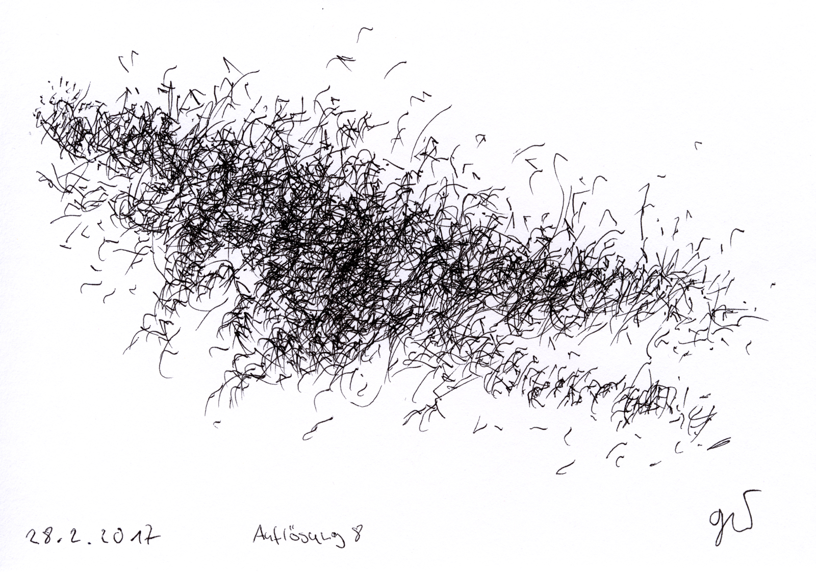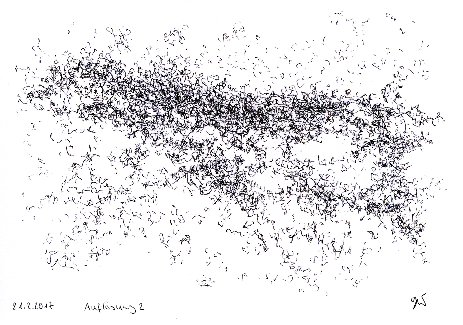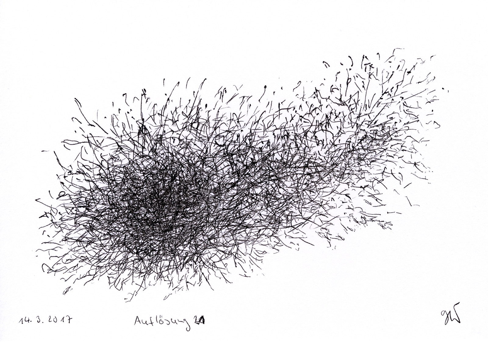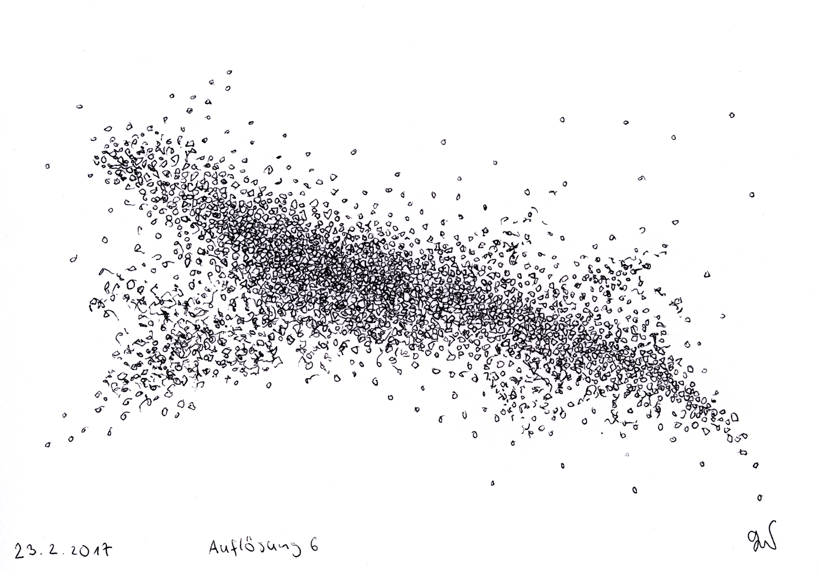 Am 20. Februar 2017, vier Jahre und vier Monate nach dem Tod unseres Sohnes Albert, dachte ich über seinen Körper unter der Erde nach. Wie sehr mochte er sich schon aufgelöst haben, in seiner Umgebung versunken sein? Mit diesen Gedanken machte ich eine erste Zeichnung. Während ich an weiteren Bildern arbeitete, bewegte ich innerlich den Begriff Auflösung: Auflösung von anderen Flüssigkeiten in Wasser, im Meer — von Gasen in Luft — von Wolken am Himmel — durch eine Explosion — bei organischen Prozessen, wie Verwelken von Pflanzen, Verderben von Lebensmitteln — einer Menschenmenge — als Ende einer Beziehung — als Vergessen — als Verwandlung oder Verschwinden. Und immer wieder kehrte ich zu Albert zurück…