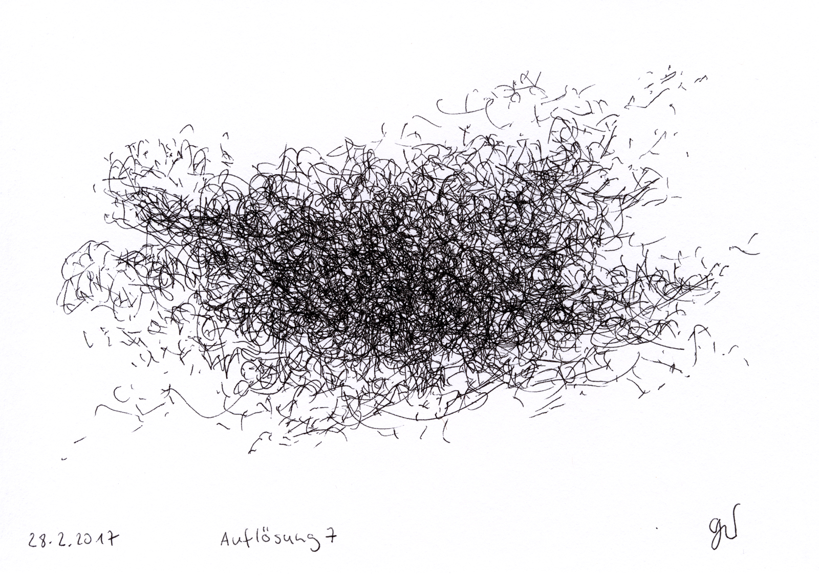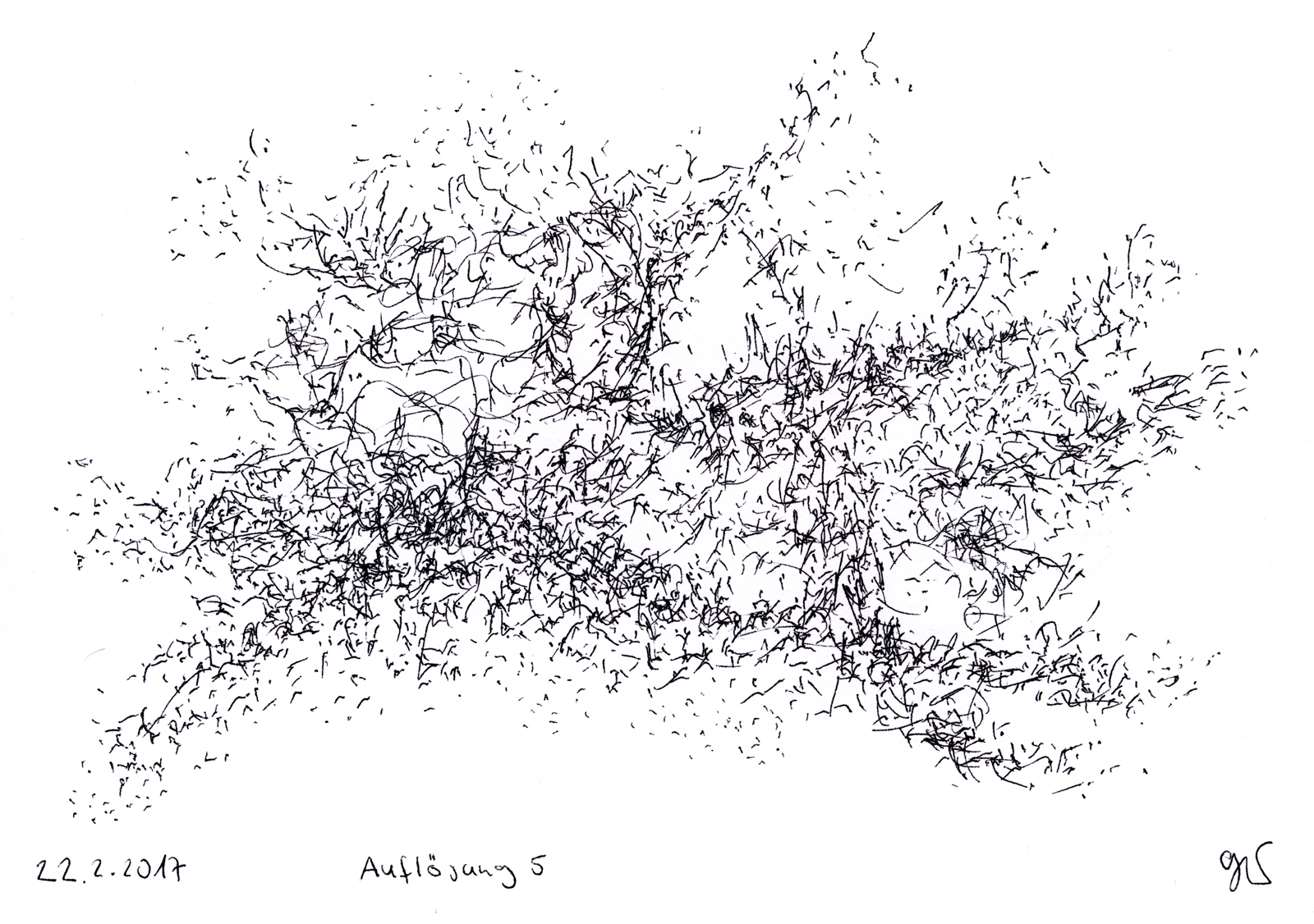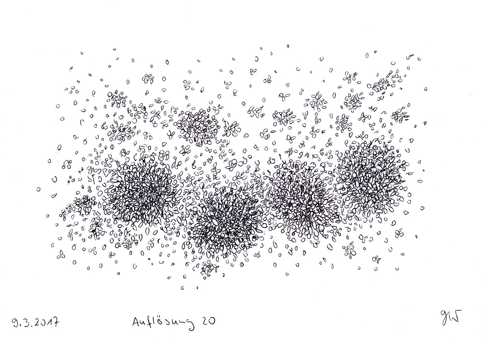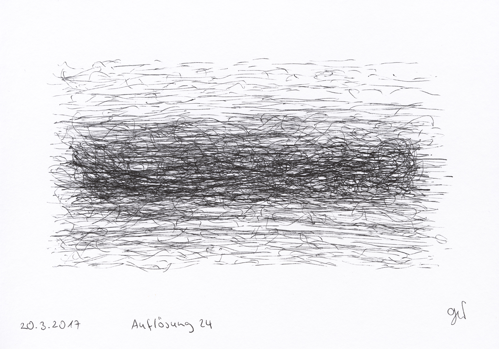 Am 20. Februar 2017, vier Jahre und vier Monate nach dem Tod unseres Sohnes Albert, dachte ich über seinen Körper unter der Erde nach. Wie sehr mochte er sich schon aufgelöst haben, in seiner Umgebung versunken sein? Mit diesen Gedanken machte ich eine erste Zeichnung. Während ich an weiteren Bildern arbeitete, bewegte ich innerlich den Begriff Auflösung: Auflösung von anderen Flüssigkeiten in Wasser, im Meer — von Gasen in Luft — von Wolken am Himmel — durch eine Explosion — bei organischen Prozessen, wie Verwelken von Pflanzen, Verderben von Lebensmitteln — einer Menschenmenge — als Ende einer Beziehung — als Vergessen — als Verwandlung oder Verschwinden. Und immer wieder kehrte ich zu Albert zurück…